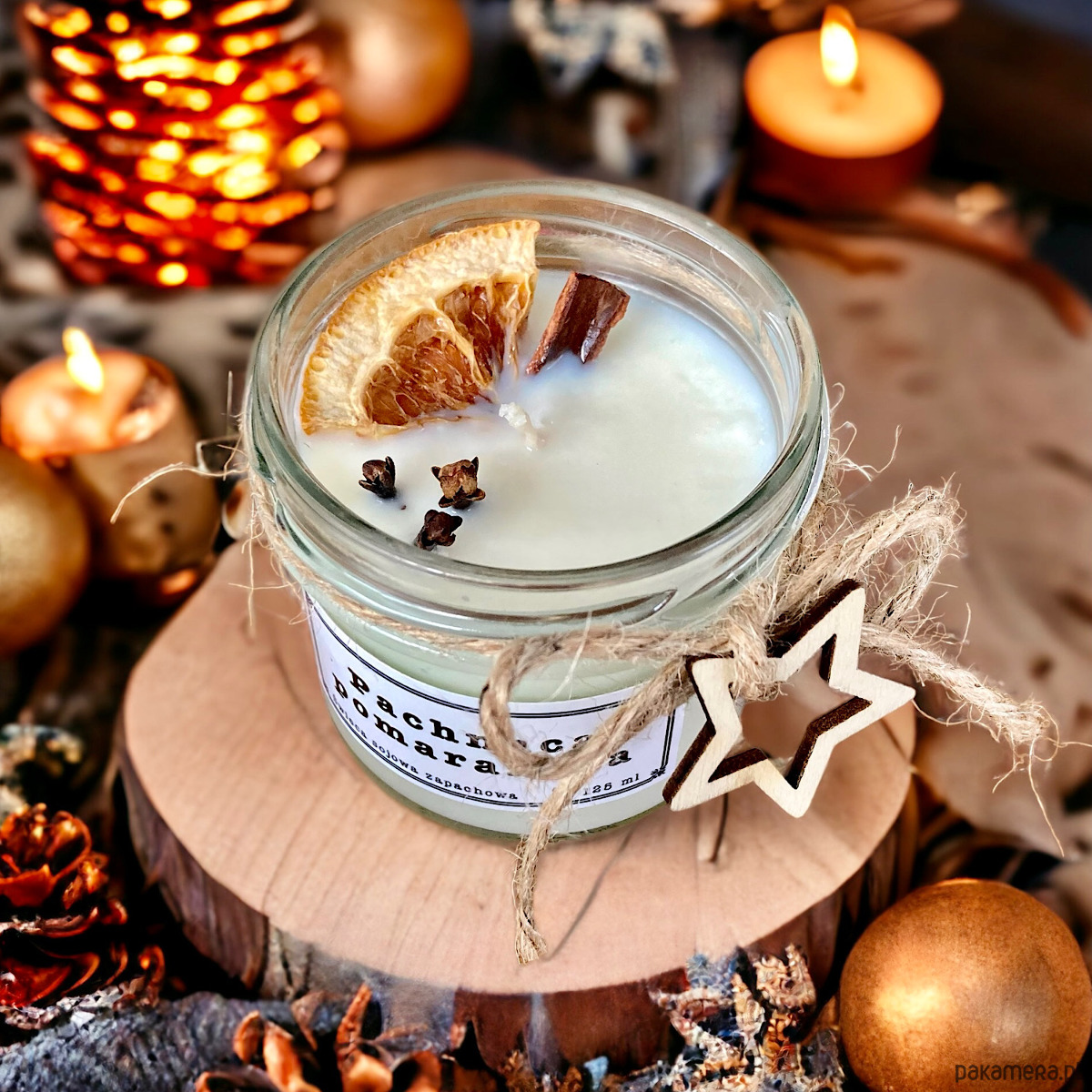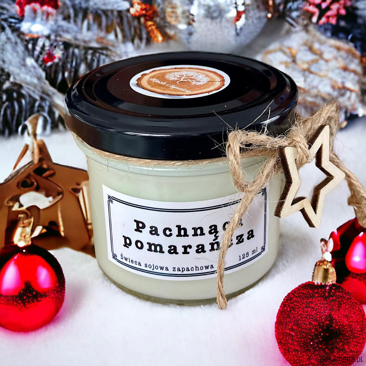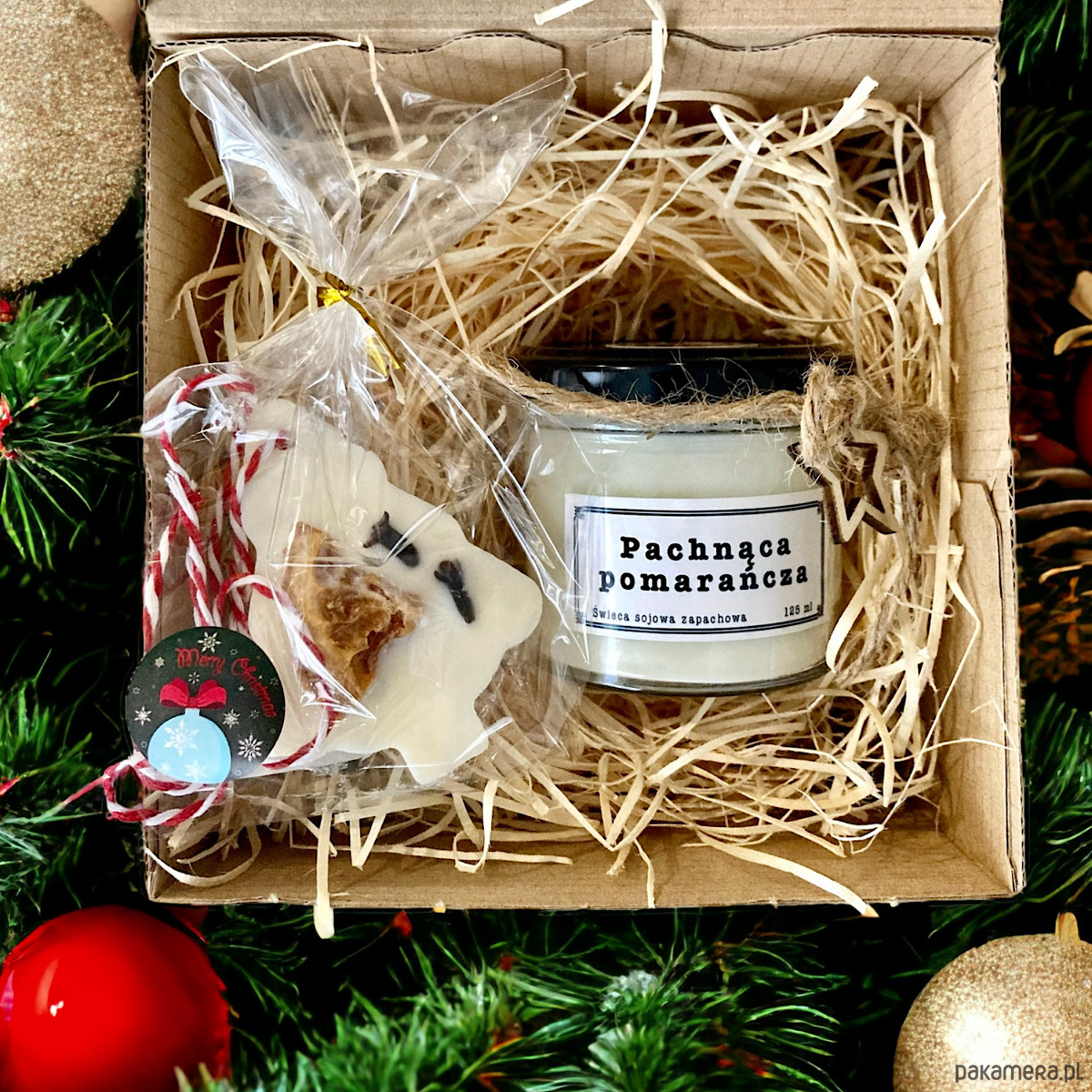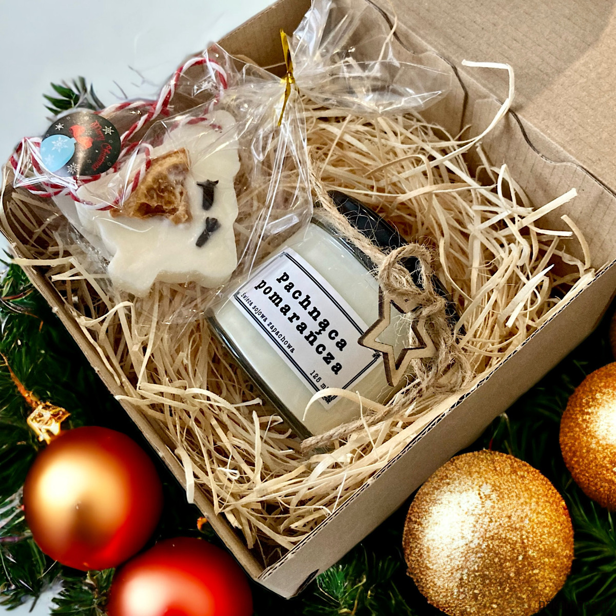 Piękny, świąteczny zestaw upominkowy składający się z pachnącej świecy sojowej w słoiczku oraz zawieszki zapachowej. Zapach pomarańczy jest orzeźwiający, korzenny, delikatnie słodki. Zawieszkę możesz powiesić w szafie, garderobie, na choince lub w innym miejscu wymagającym odświeżenia. Możesz również odłamać kawałek i rozpuścić w kominku zapachowym. Całość zapakowana jest w estetyczne pudełko prezentowe, ozdobione czerwoną wstążką oraz świątecznym bilecikiem.