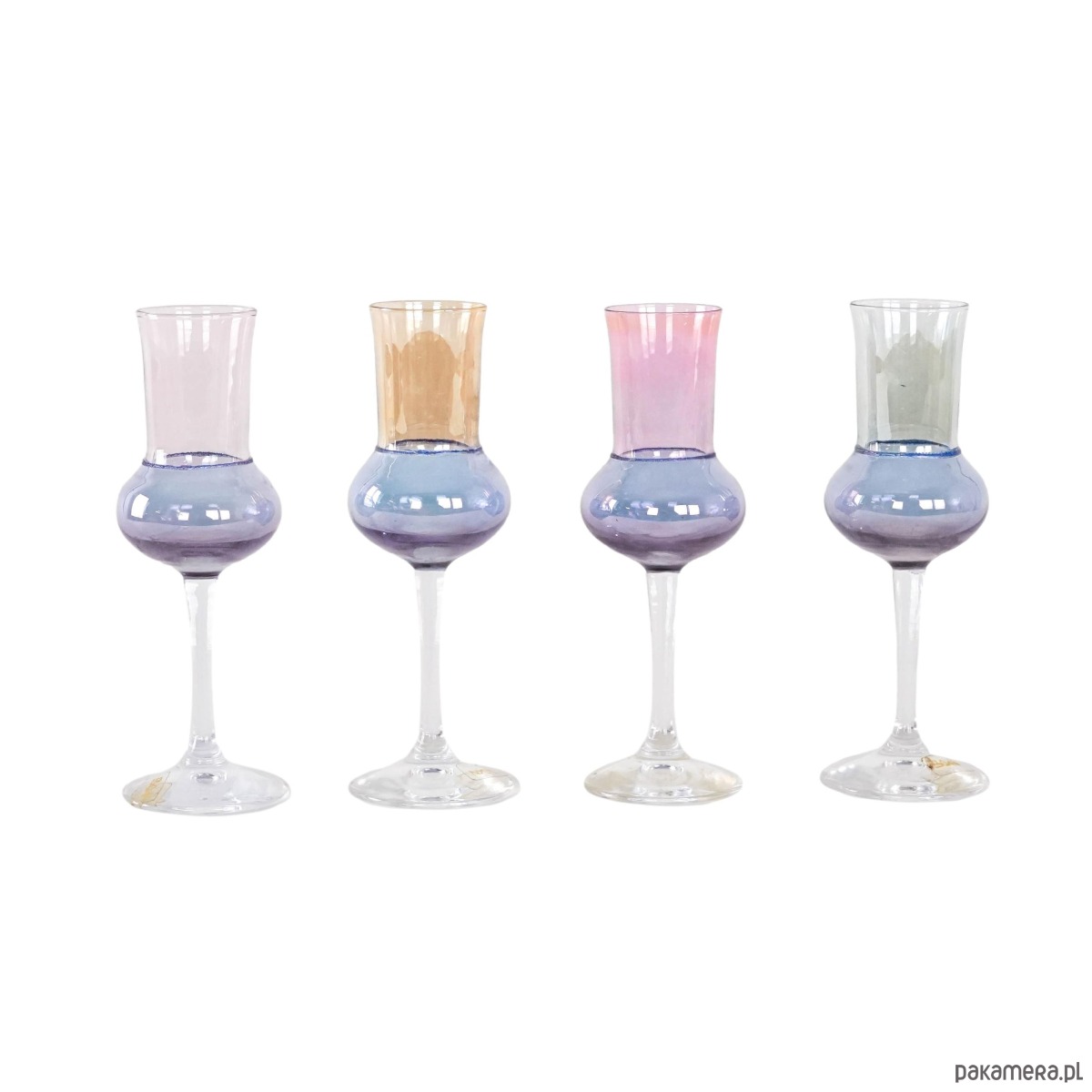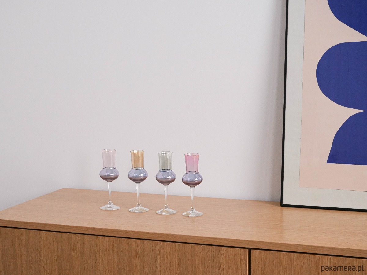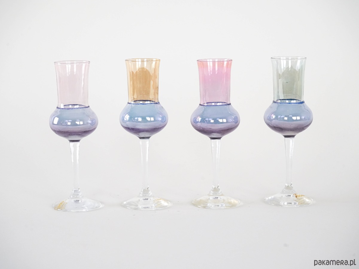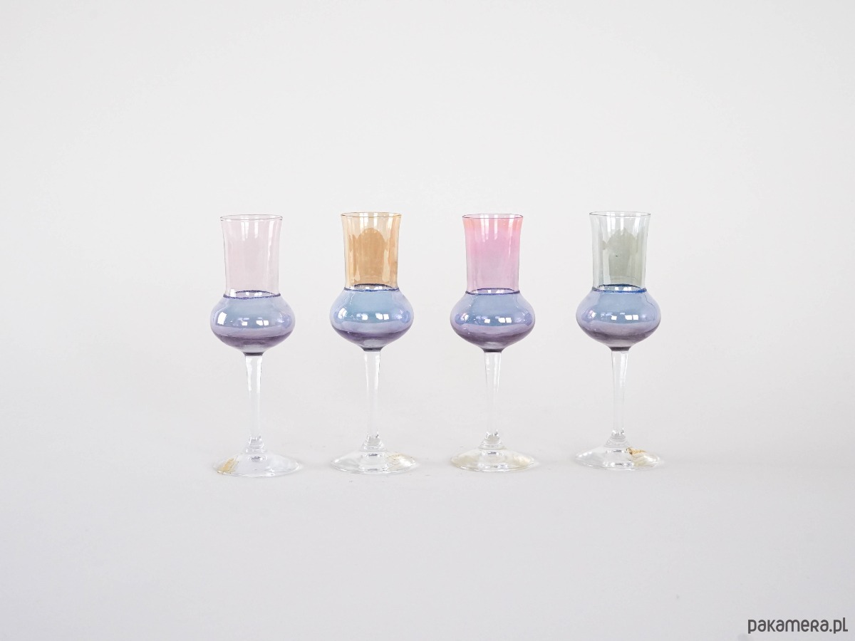Zestaw 4 eleganckich kieliszków vintage z lat 70., utrzymanych w delikatnych pastelowych kolorach. Smukła forma oraz subtelna kolorystyka nadają im lekkości i wyjątkowego charakteru, typowego dla designu tej epoki. Kolorowe szkło pięknie odbija światło, dzięki czemu kieliszki prezentują się niezwykle efektownie zarówno podczas użytkowania, jak i jako dekoracja stołu. Świetnie sprawdzą się do serwowania likierów, nalewek lub deserowych trunków. To doskonała propozycja dla miłośników szkła vintage oraz oryginalnych elementów zastawy stołowej inspirowanych stylistyką lat 70.