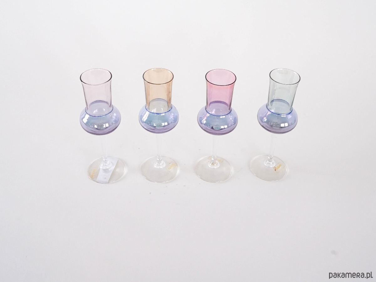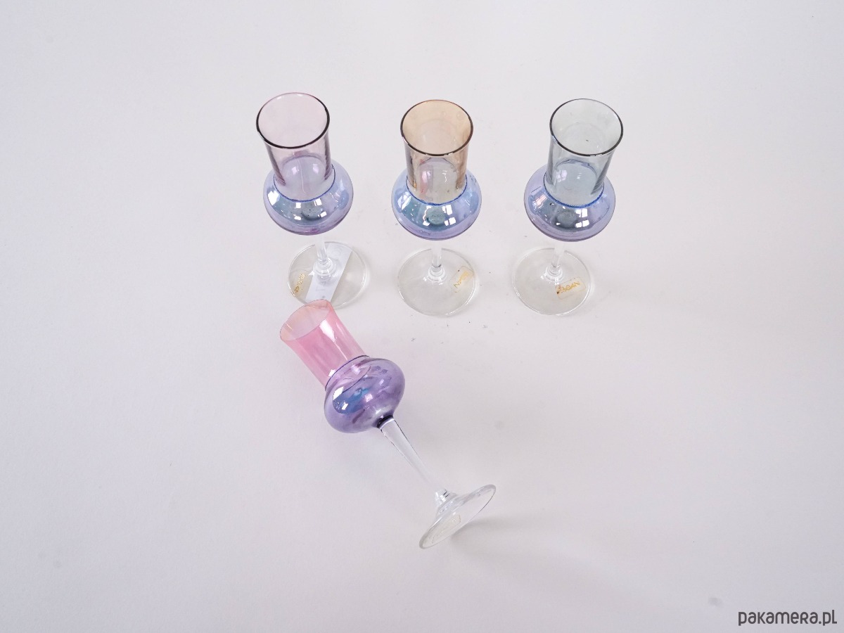 Zestaw pastelowych kieliszków został wykonany w latach 70-tych, produkcja włoska.