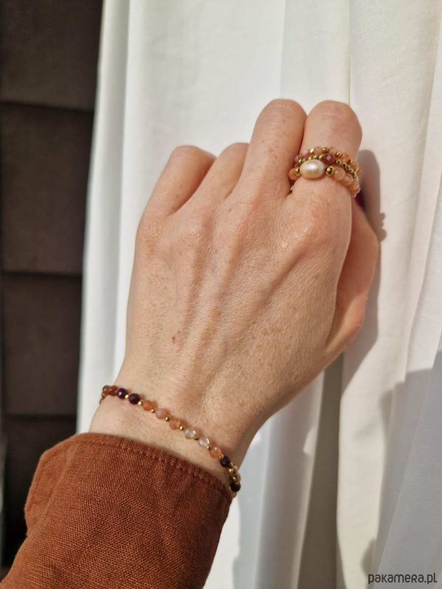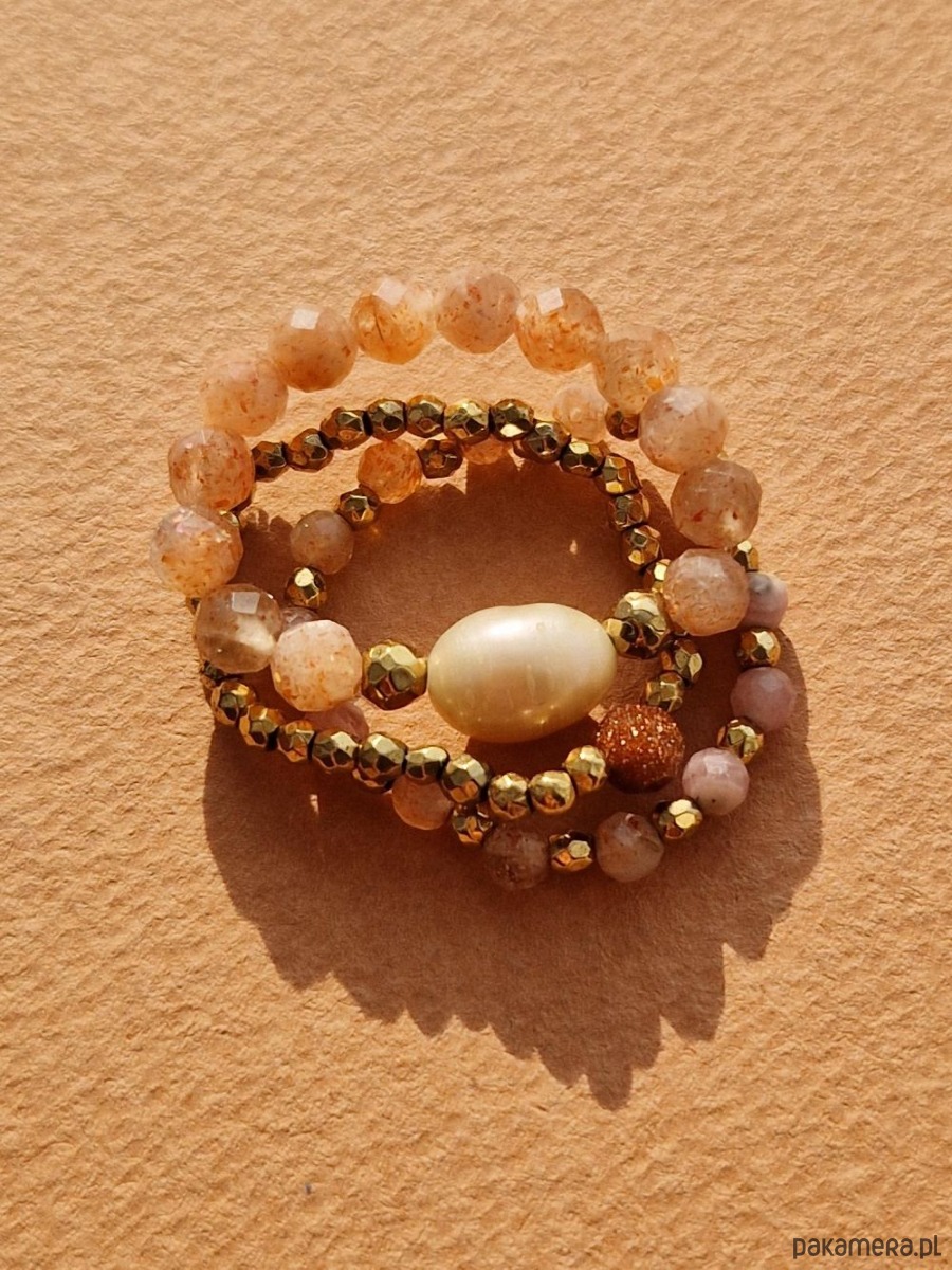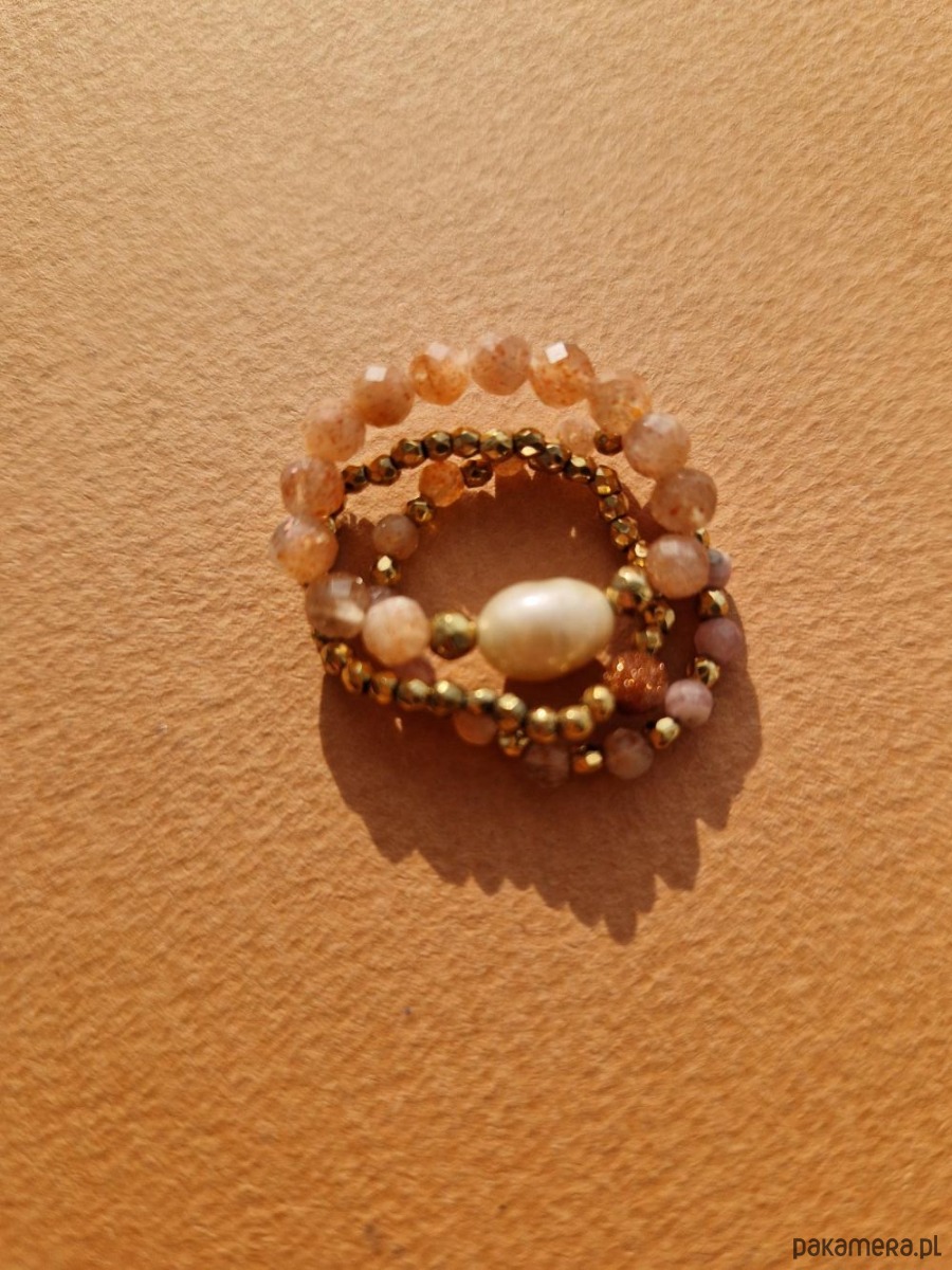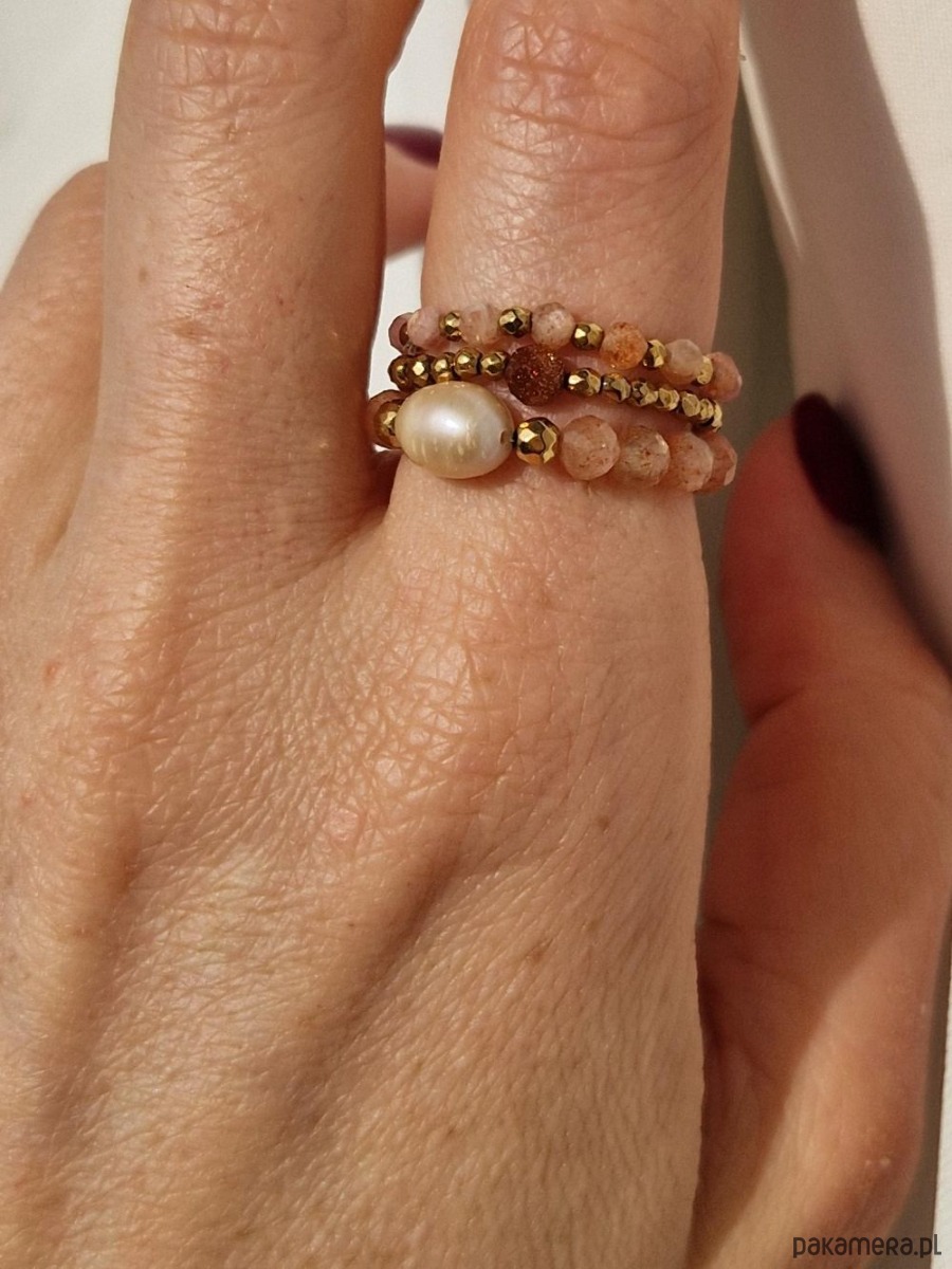 Zestaw pastelowych pierścionków wykonanych ręcznie z naturalnych kamieni słonecznych, różowych rodochrozytów i złotych kulek hematytów. Jeden z pierścionków został ozdobiony naturalną perłą w kolorze łososiowym. Pierścionki przywołują wiosenny klimat i pięknie dopełniają każdą stylizację. W innych ofertach możesz znaleźć naszyjnik lub bransoletkę do kompletu.