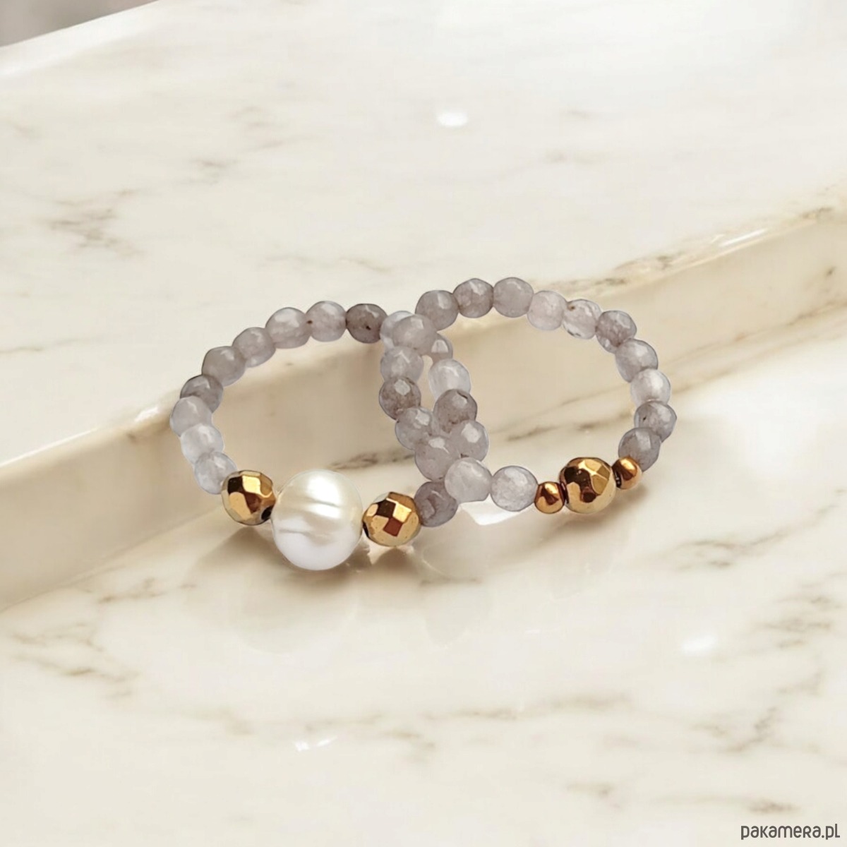 Pierścionki elastyczne zostały wykonane z drobniutkich kuleczek fasetowanego agatu szarego 3mm, naturalnej perły słodkowodnej , przekładek ze złotego hematytu.