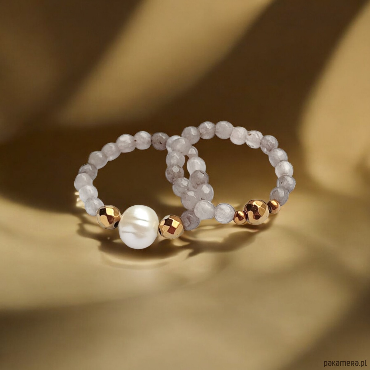 Pierścionki elastyczne zostały wykonane z drobniutkich kuleczek fasetowanego agatu szarego 3mm, naturalnej perły słodkowodnej , przekładek ze złotego hematytu.