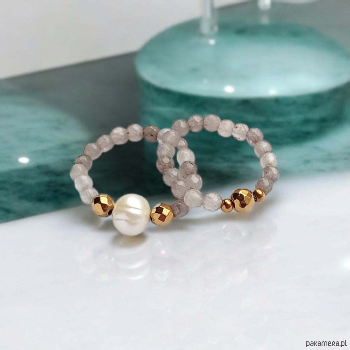 Pierścionki elastyczne zostały wykonane z drobniutkich kuleczek fasetowanego agatu szarego 3mm, naturalnej perły słodkowodnej , przekładek ze złotego hematytu.