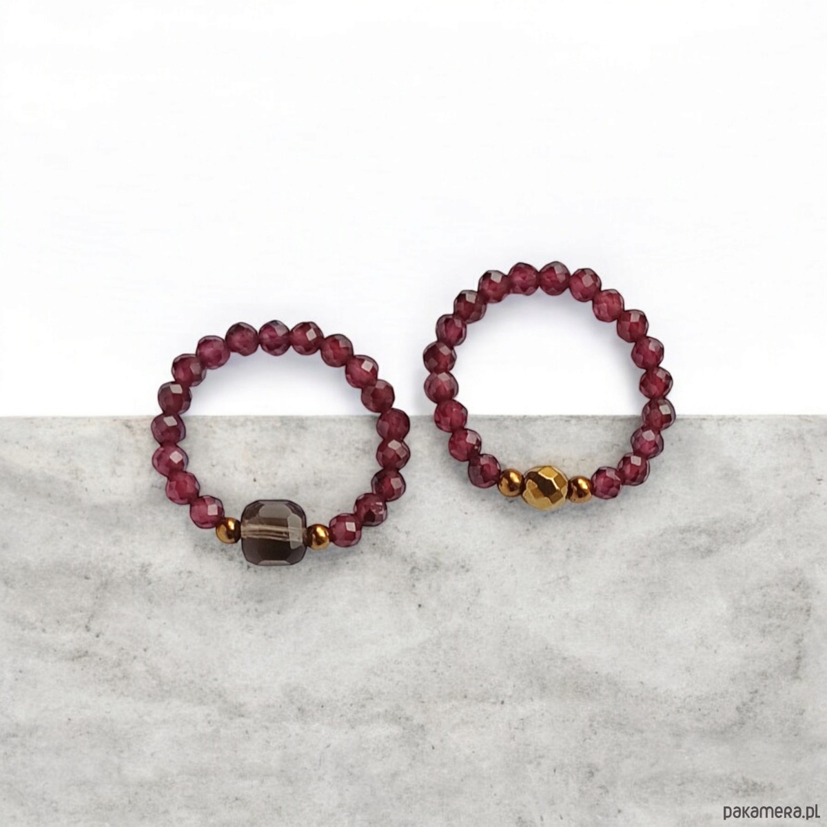 Pierścionki elastyczne zostały wykonane z drobniutkich kuleczek fasetowanego granatu (niecałe 3mm) oraz kostki fasetowanego kwarcu dymnego i przekładek ze złotego hematytu.