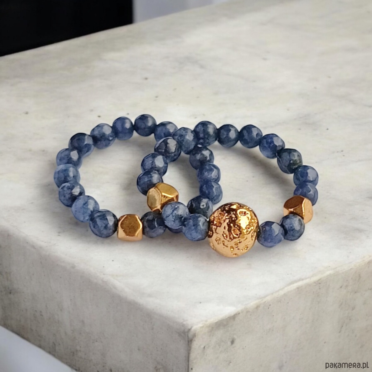 Pierścionki elastyczne zostały wykonane z kuleczek fasetowanego jadeitu w szafirowym odcieniu granatu (3mm) oraz kuli platerowanej lawy i przekładek ze złotego hematytu.