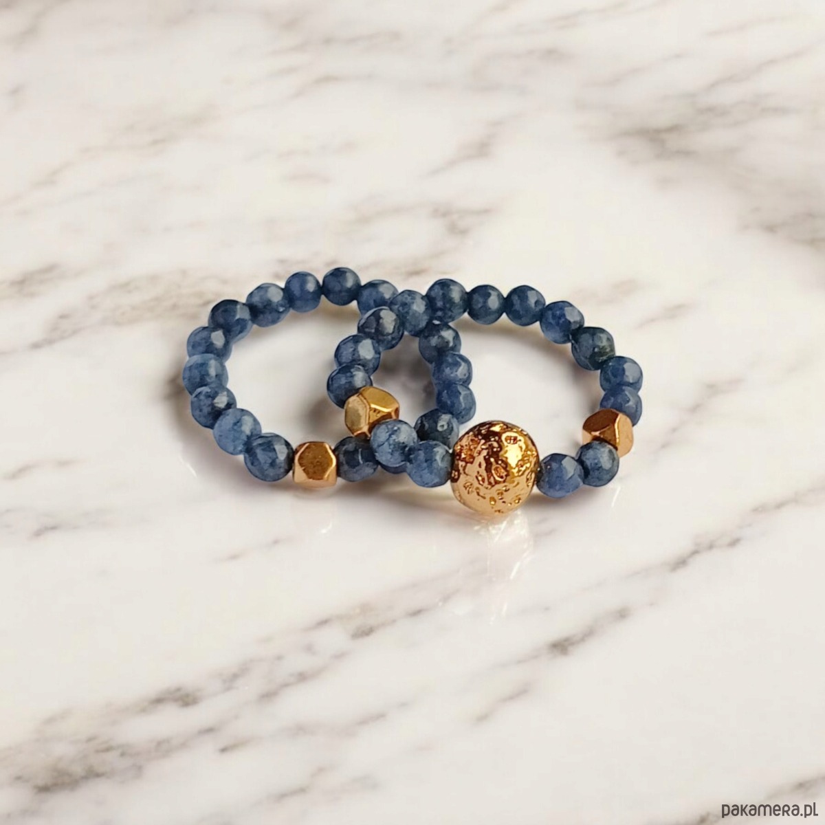 Pierścionki elastyczne zostały wykonane z kuleczek fasetowanego jadeitu w szafirowym odcieniu granatu (3mm) oraz kuli platerowanej lawy i przekładek ze złotego hematytu.