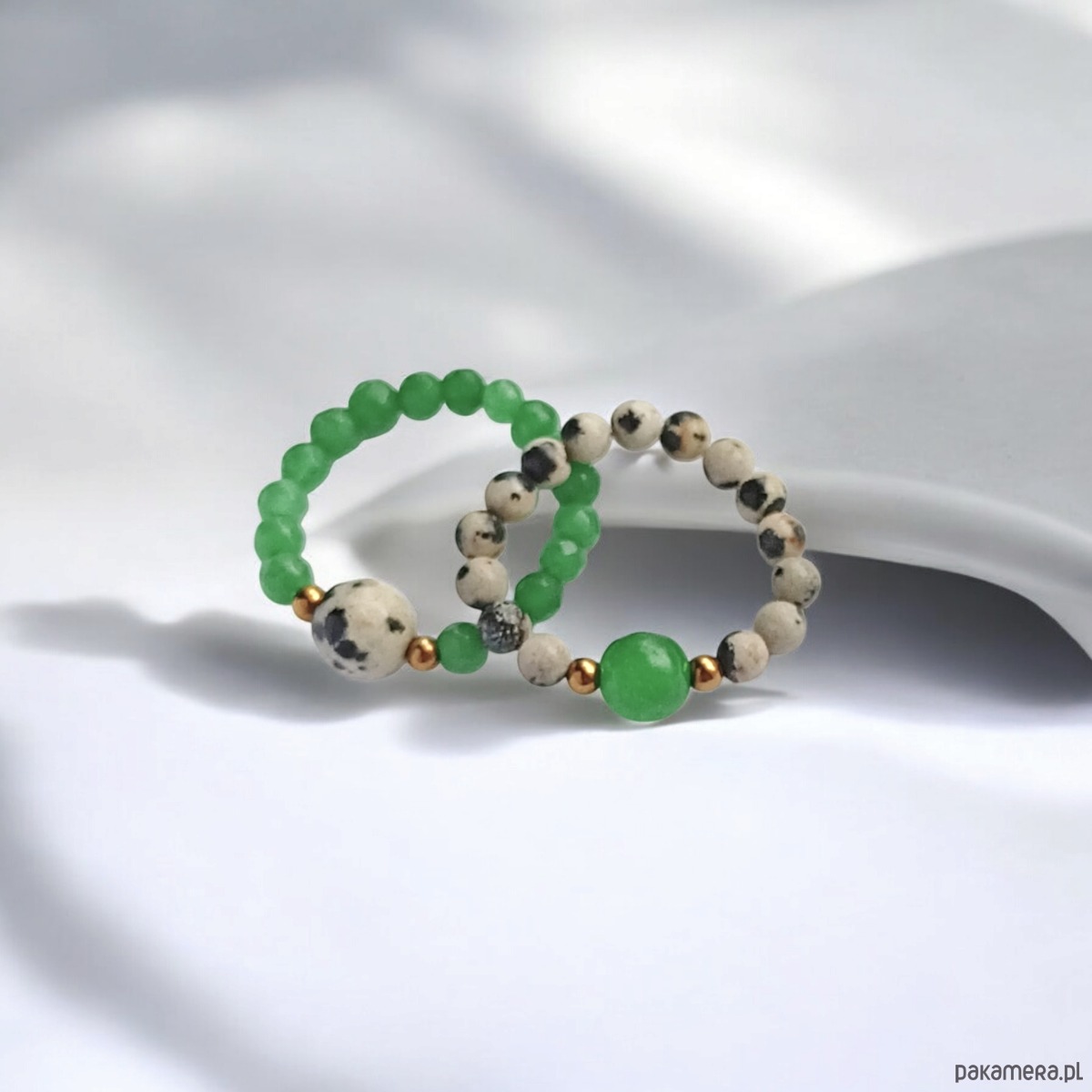 Pierścionki elastyczne zostały wykonane z kuleczek fasetowanego jadeitu oraz jaspisu dalmatyńskiego (3 i 6 mm) oraz przekładek ze złotego hematytu.