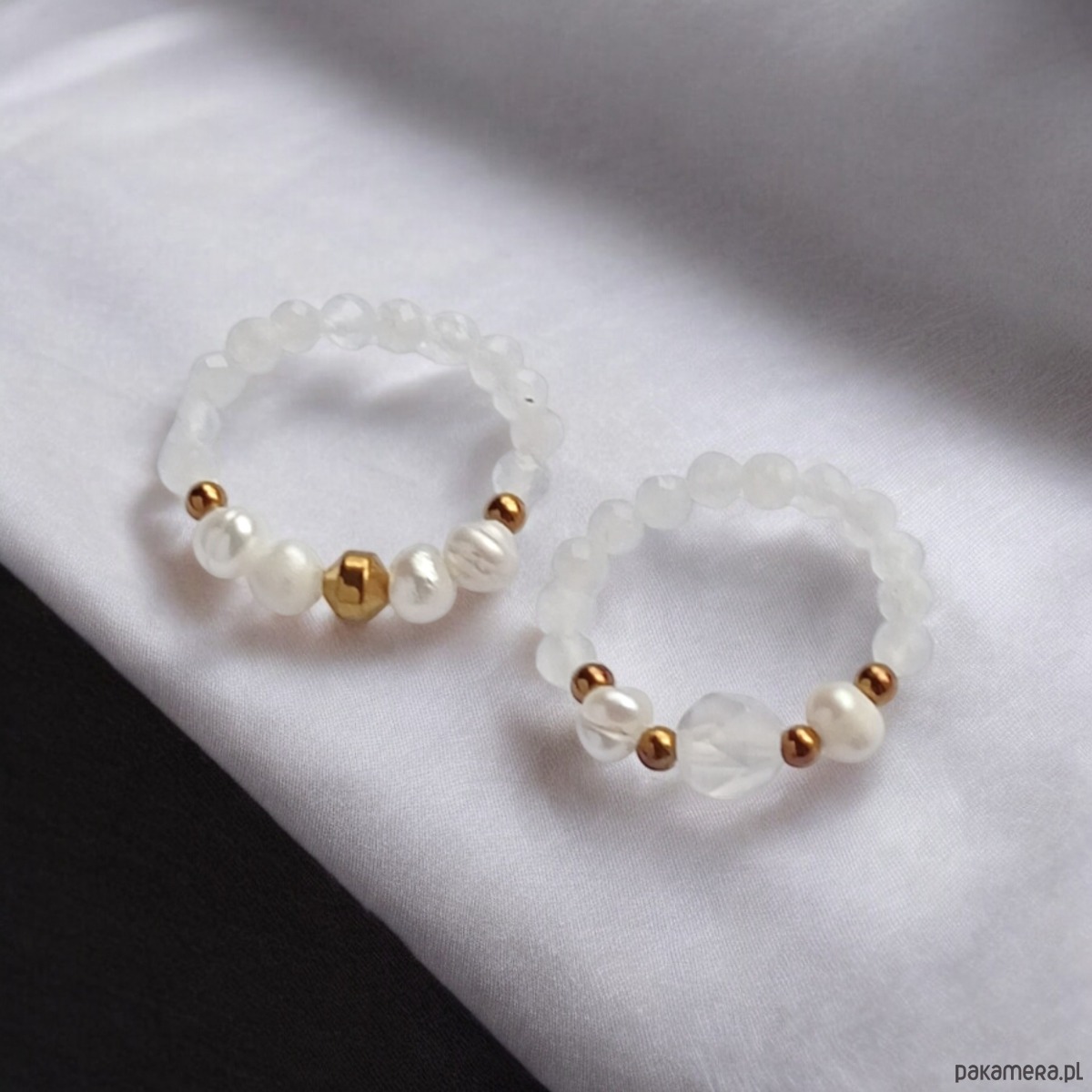 Pierścionki elastyczne zostały wykonane z kuleczek fasetowanego KAMIENIA KSIĘŻYCOWEGO (3mm) oraz NATURALNYCH, DROBNYCH PEREŁ, białego agatu 6mm i przekładek ze złotego hematytu.