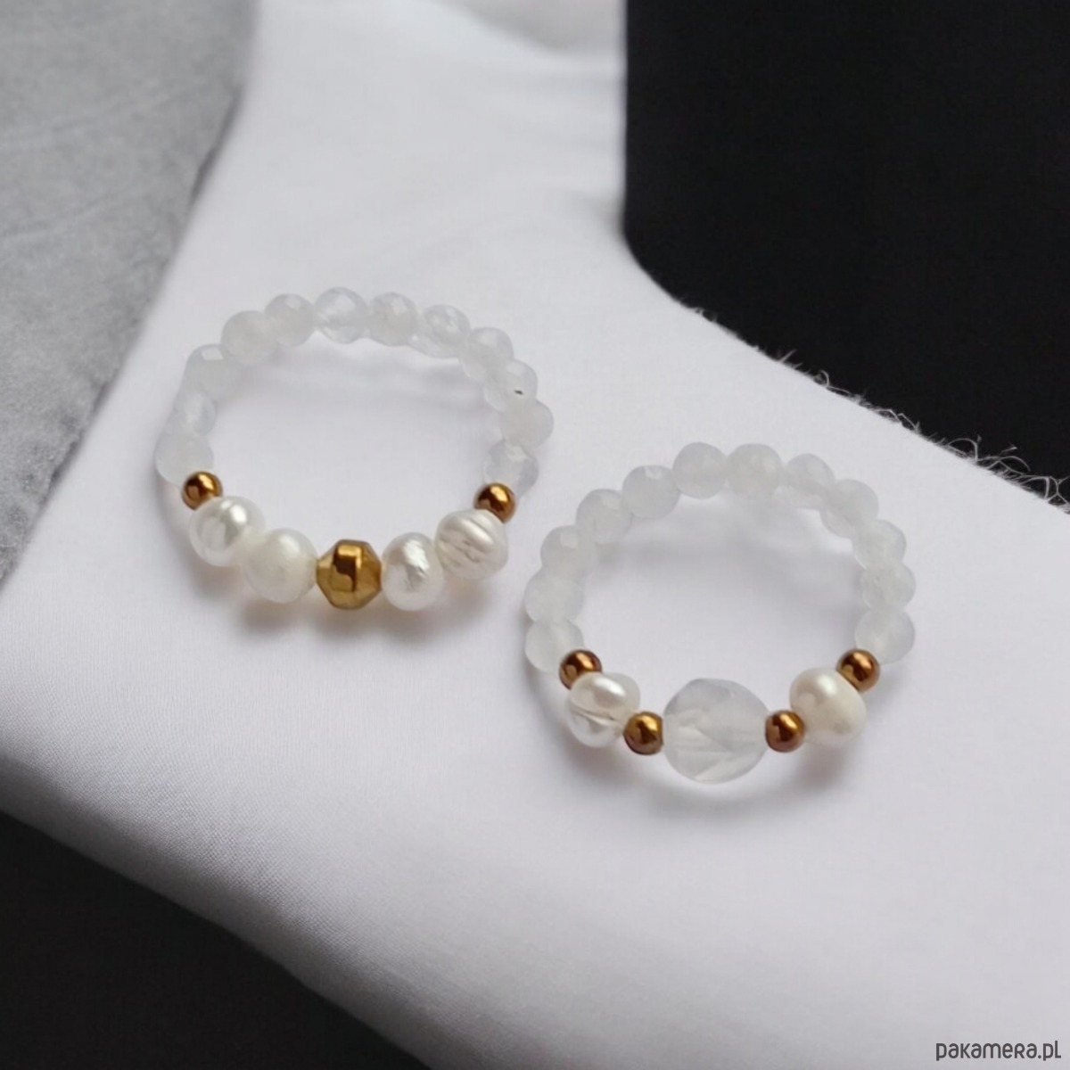 Pierścionki elastyczne zostały wykonane z kuleczek fasetowanego KAMIENIA KSIĘŻYCOWEGO (3mm) oraz NATURALNYCH, DROBNYCH PEREŁ, białego agatu 6mm i przekładek ze złotego hematytu.