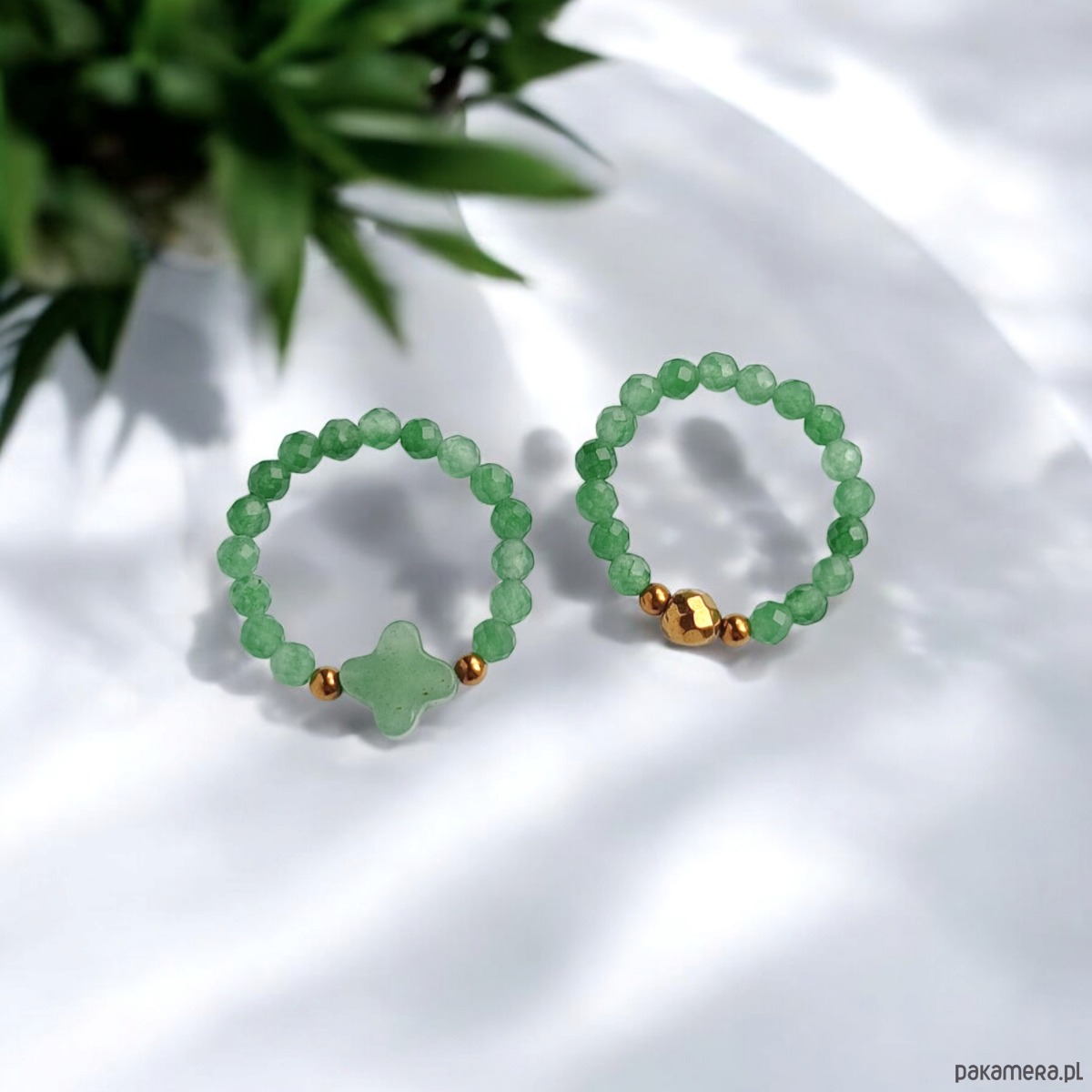 Pierścionki elastyczne zostały wykonane z marokańskiej koniczynki i drobniutkich kuleczek fasetowanego awenturynu (3mm) oraz przekładek ze złotego hematytu.