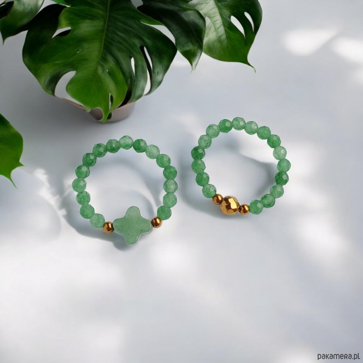 Pierścionki elastyczne zostały wykonane z marokańskiej koniczynki i drobniutkich kuleczek fasetowanego awenturynu (3mm) oraz przekładek ze złotego hematytu.