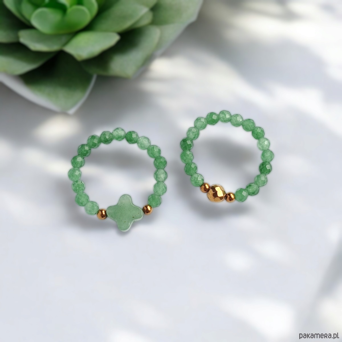 Pierścionki elastyczne zostały wykonane z marokańskiej koniczynki i drobniutkich kuleczek fasetowanego awenturynu (3mm) oraz przekładek ze złotego hematytu.