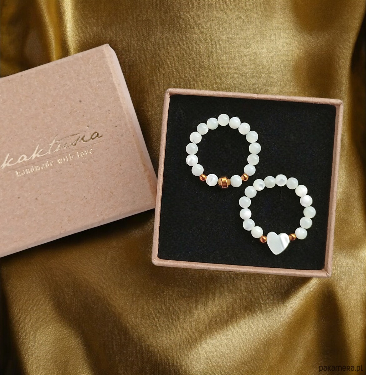Pierścionki elastyczne zostały wykonane z kuleczek białej muszli (ok.3,3mm), serduszka z muszli i przekładek ze złotego hematytu.