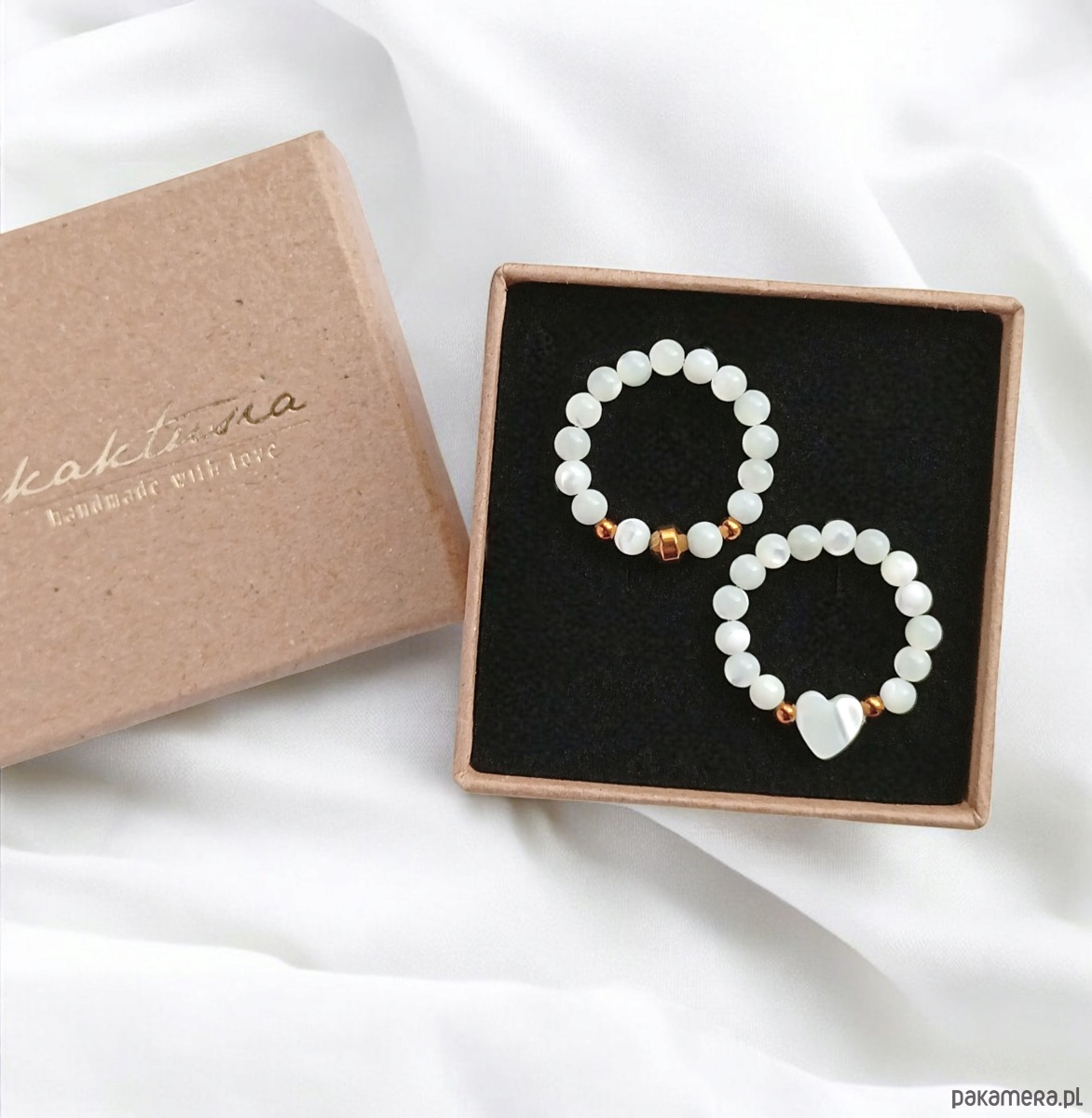 Pierścionki elastyczne zostały wykonane z kuleczek białej muszli (ok.3,3mm), serduszka z muszli i przekładek ze złotego hematytu.