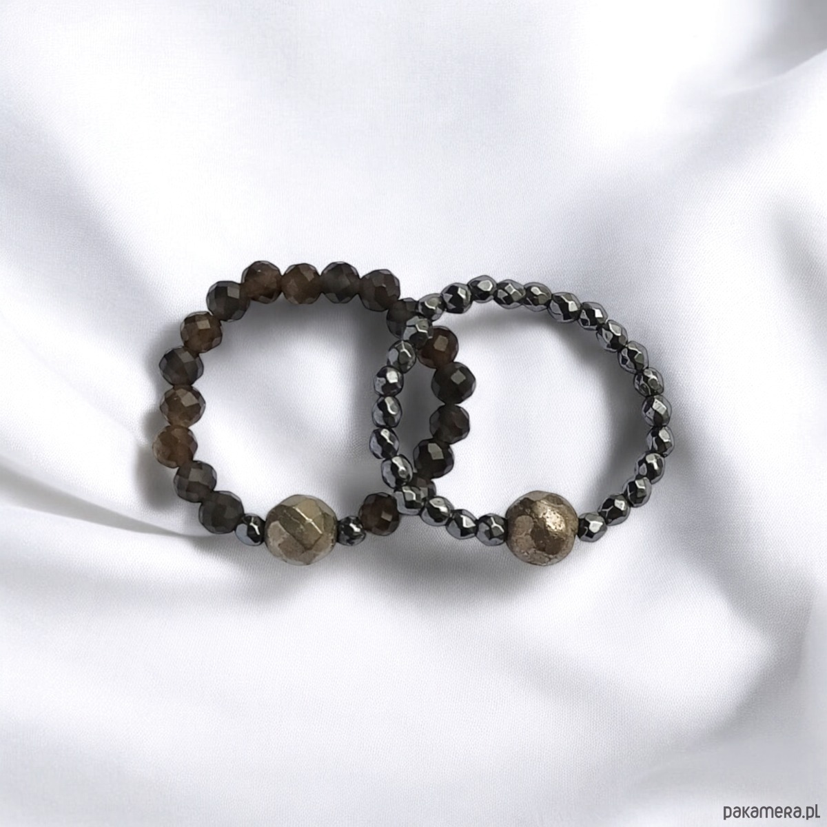 Pierścionki elastyczne zostały wykonane z drobniutkich kuleczek fasetowanego hematytu 2mm, obsydianu złotego 3mm oraz pirytu ok.6mm.