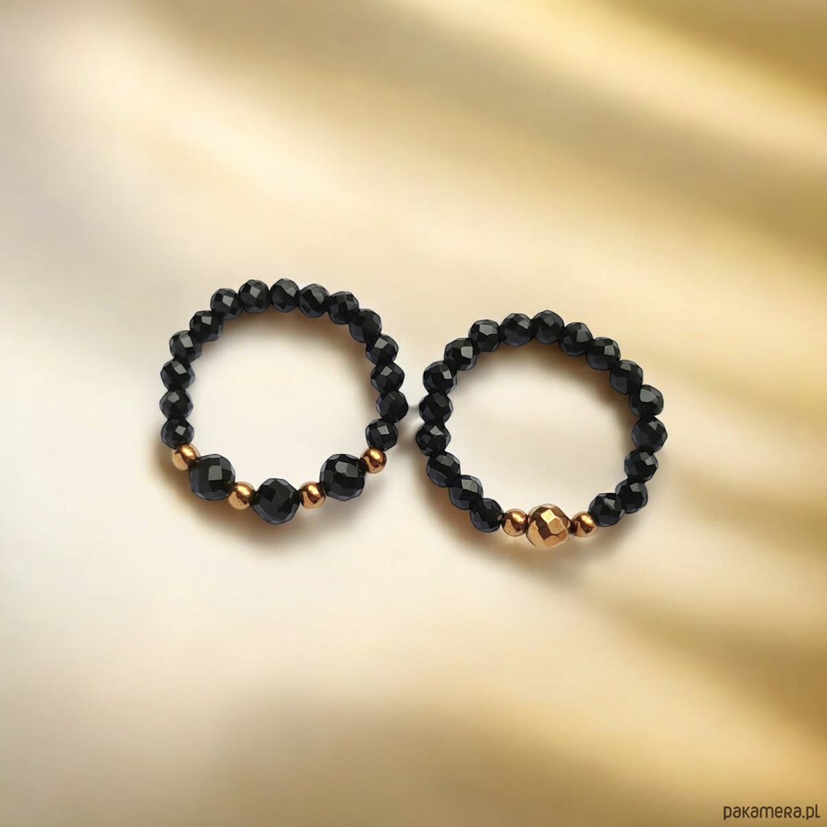 Pierścionki elastyczne zostały wykonane z drobniutkich kuleczek fasetowanego onyksu 3 i 4mm oraz przekładek ze złotego hematytu.