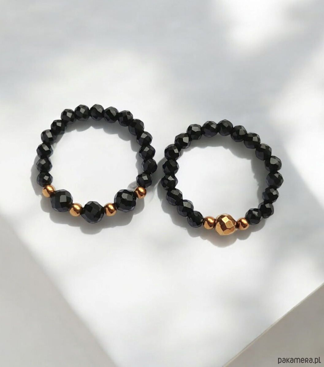 Pierścionki elastyczne zostały wykonane z drobniutkich kuleczek fasetowanego onyksu 3 i 4mm oraz przekładek ze złotego hematytu.