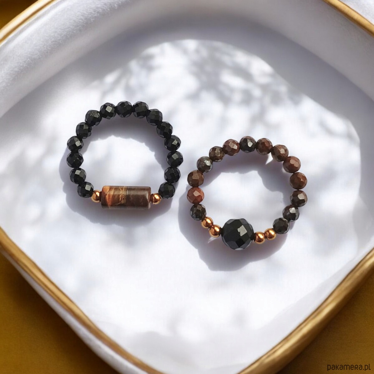 Pierścionki elastyczne zostały wykonane z kuleczek fasetowanego turmalinu i tygrysiego oka (ok. 2,5mm) oraz elementów z tygrysiego oka i turmalinu, z dodatkiem przekładek ze złotego hematytu.