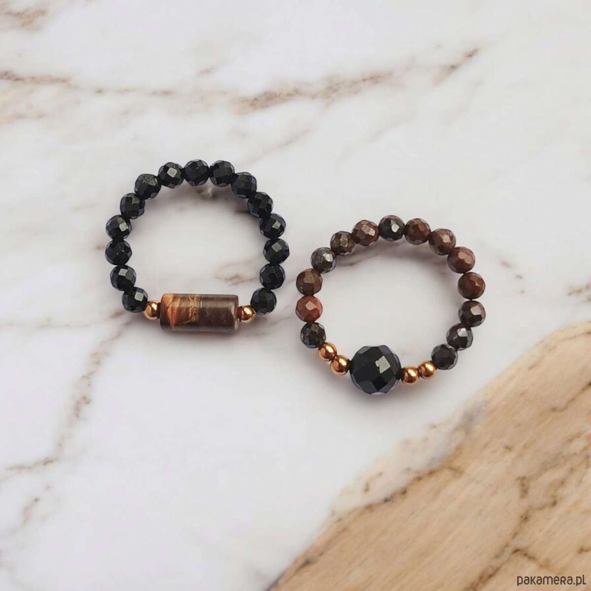 Pierścionki elastyczne zostały wykonane z kuleczek fasetowanego turmalinu i tygrysiego oka (ok. 2,5mm) oraz elementów z tygrysiego oka i turmalinu, z dodatkiem przekładek ze złotego hematytu.