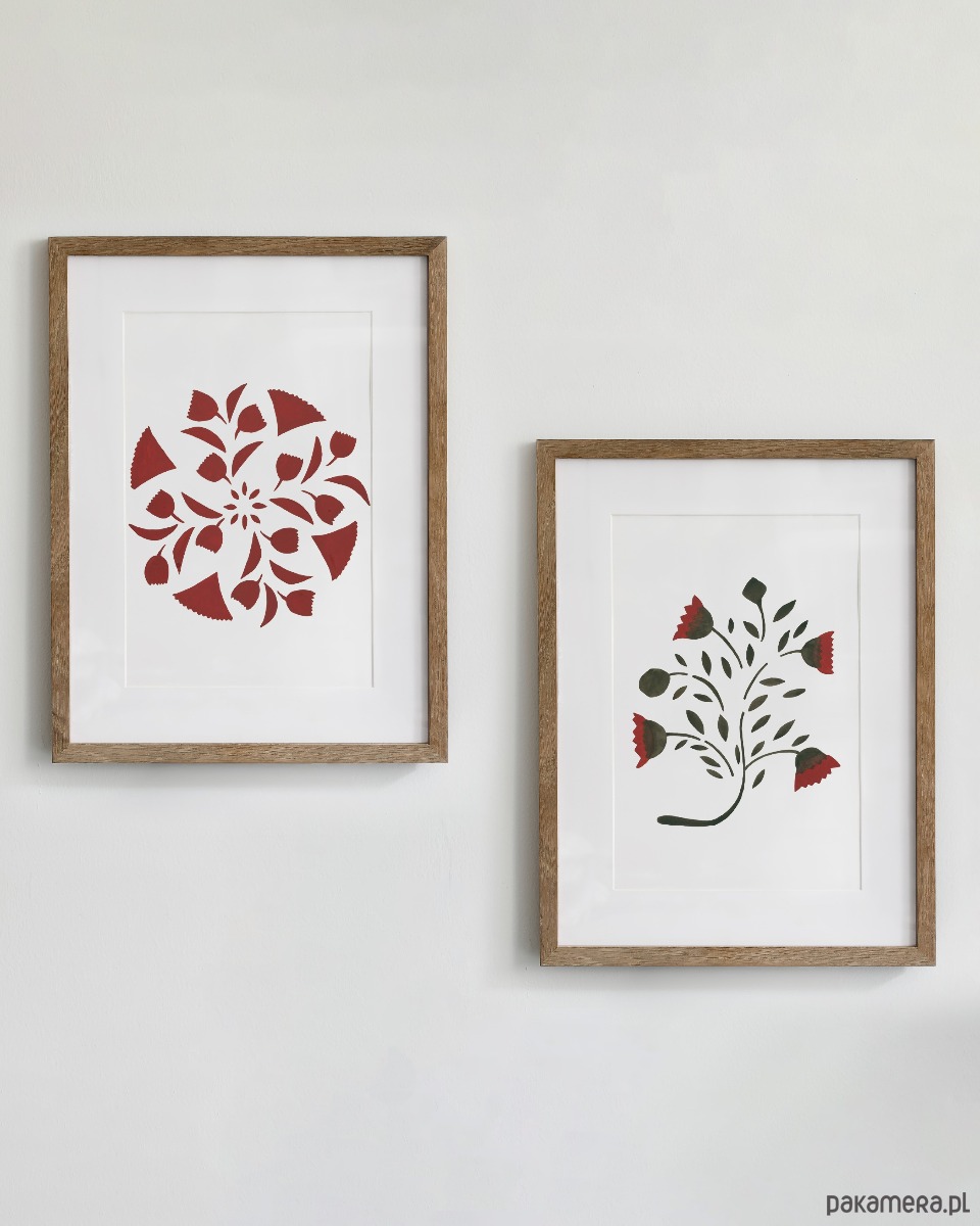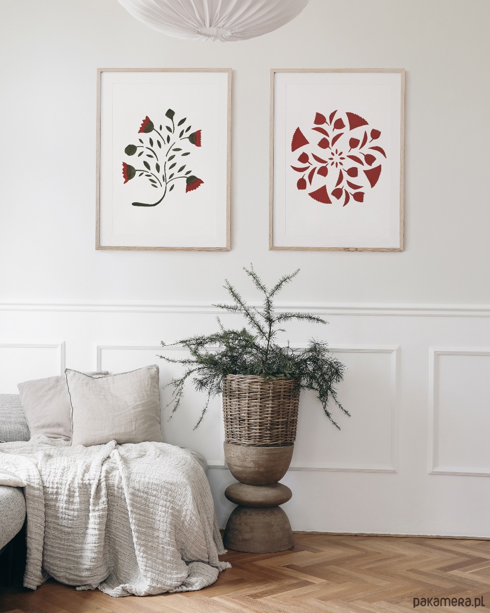 Zestaw dwóch plakatów z motywem folkowym. Kolorem nawiązują do świąt, niemniej jednak sprawdzą się równie dobrze w ciągu całego roku szczególnie w skandynawskich wnętrzach.