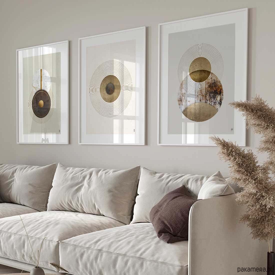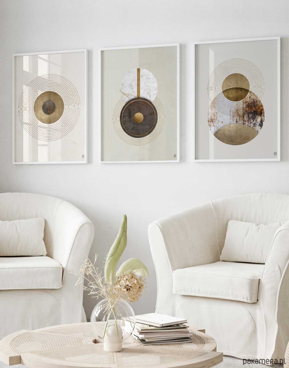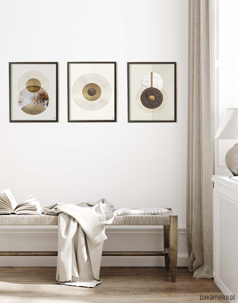 Delikatne okręgi, strukturalne detale i spokojna paleta barw tworzą spójną, wyrafinowaną dekorację ścienną, która ociepla przestrzeń i nadaje jej stylowego charakteru. Zestaw świetnie sprawdzi się w salonie, sypialni, gabinecie, przedpokoju czy eleganckiej przestrzeni komercyjnej.