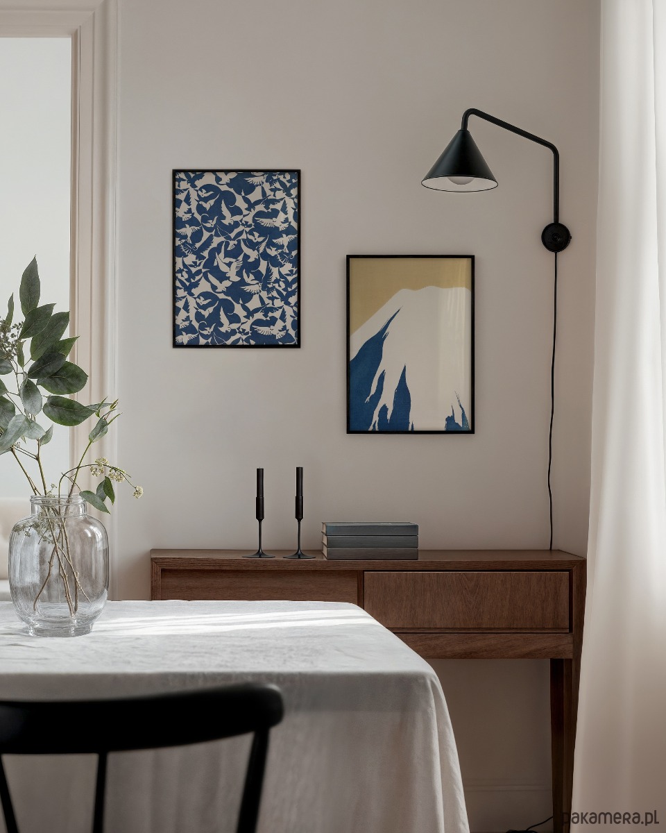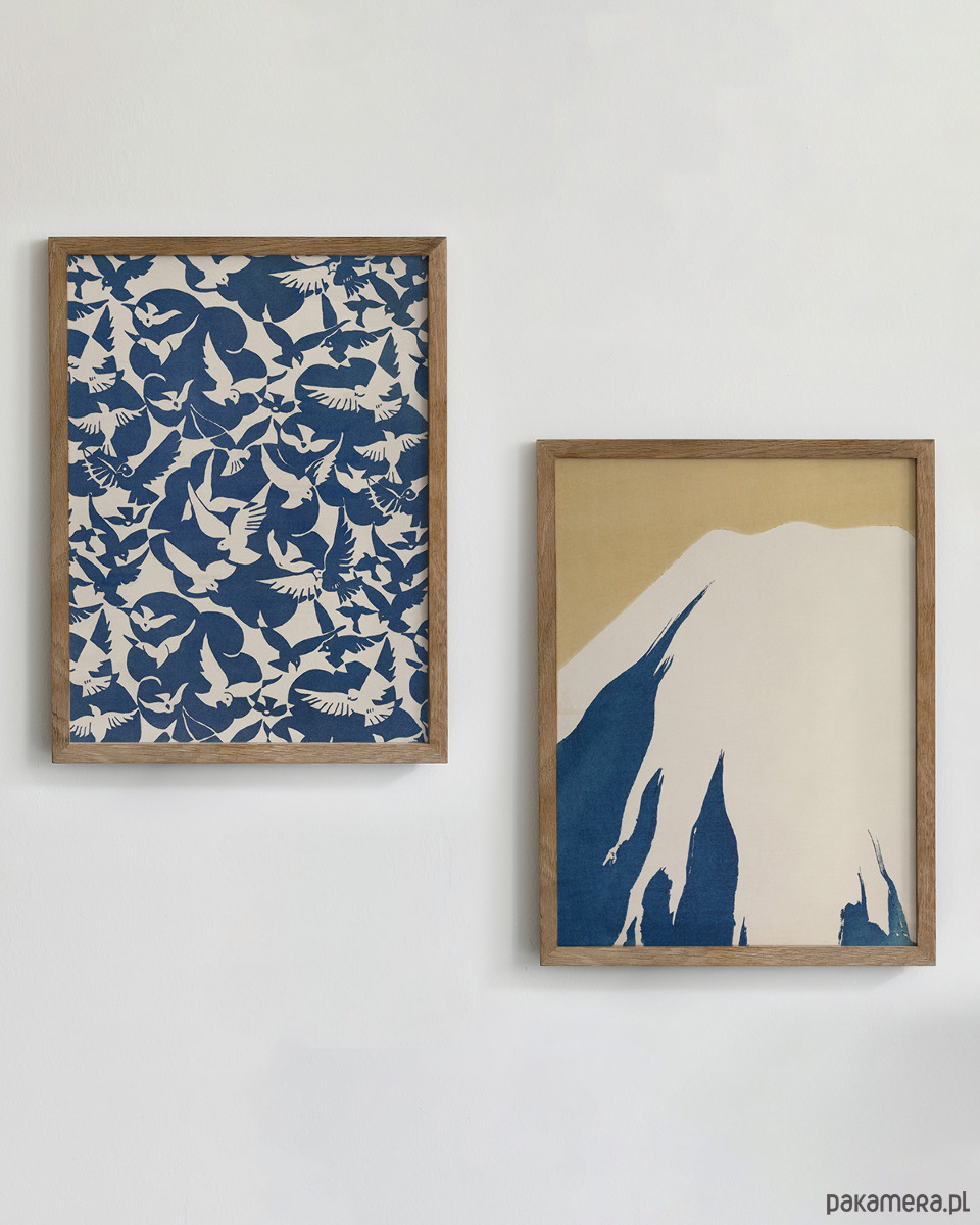 Zestaw plakatów z serii JAPANDI przedstawiający ptaki na niebieskim tle oraz górę Fuji na musztardowym tle.