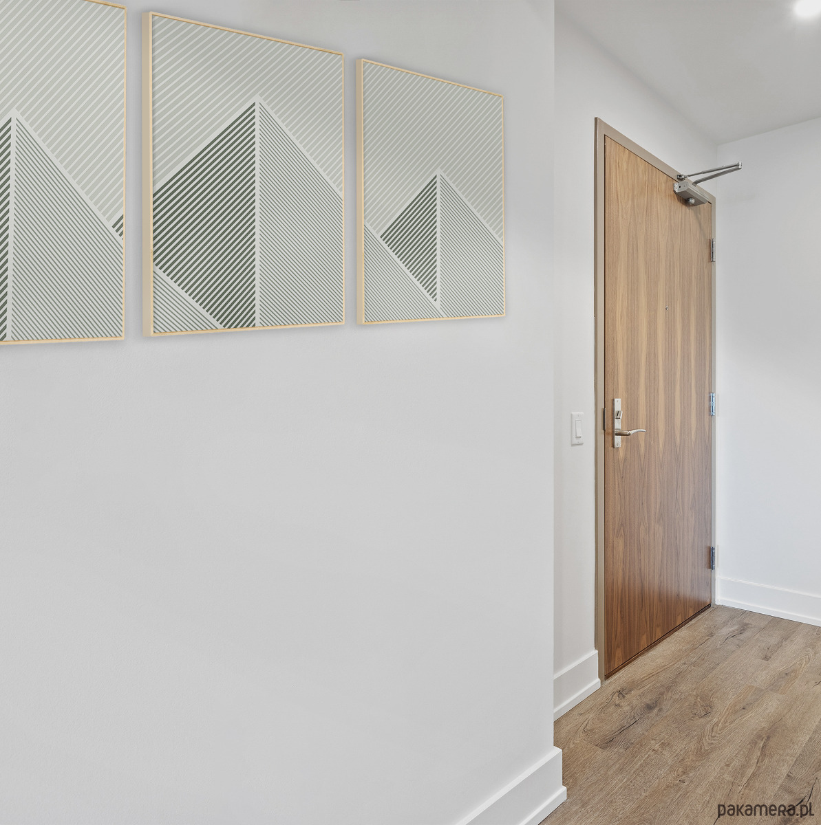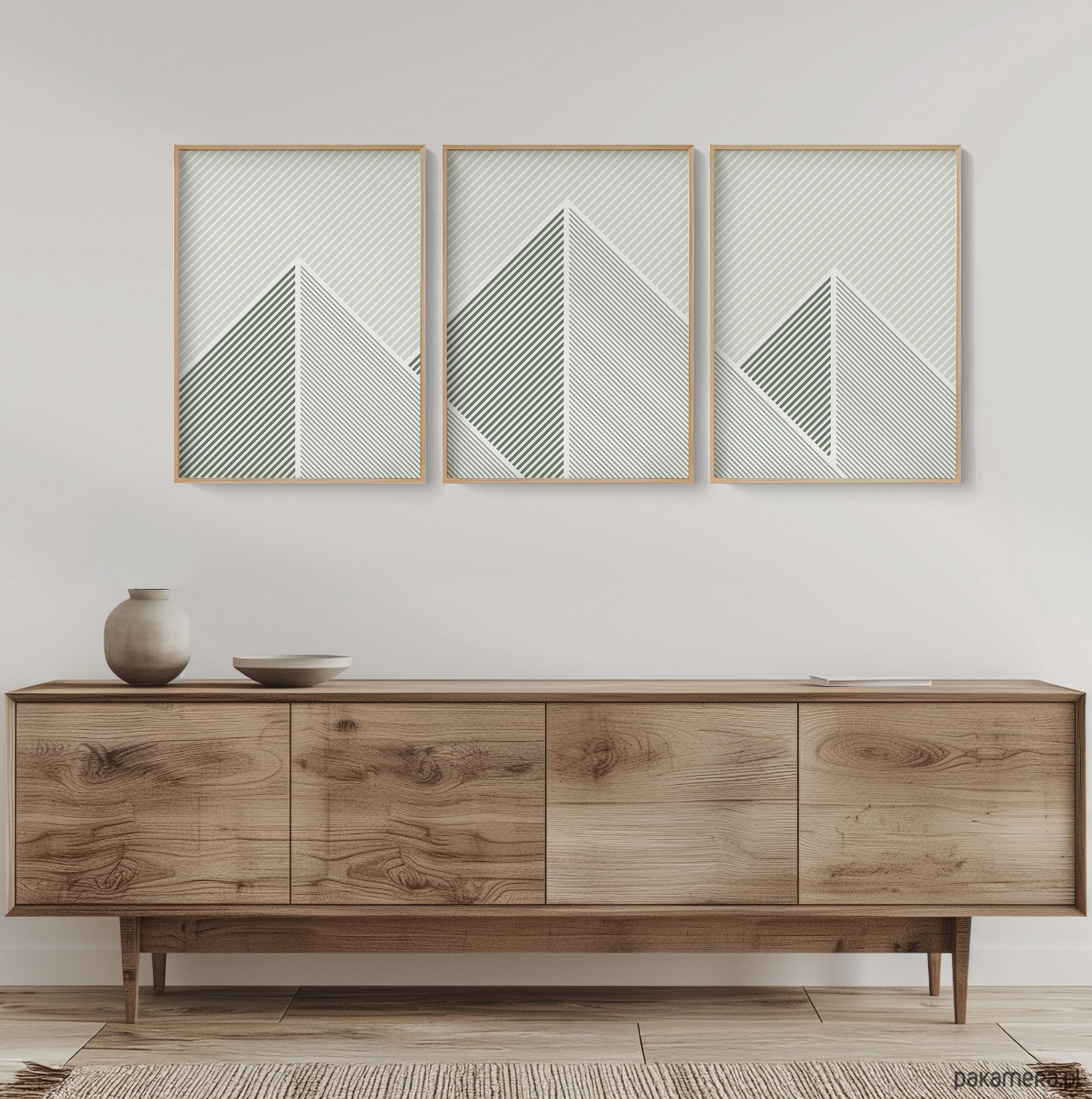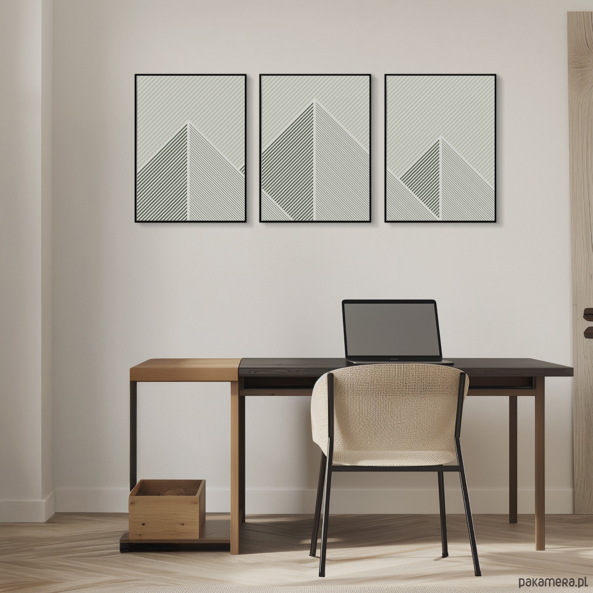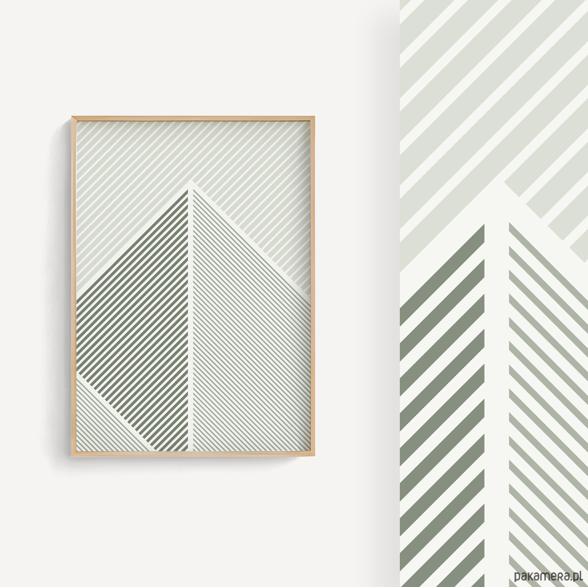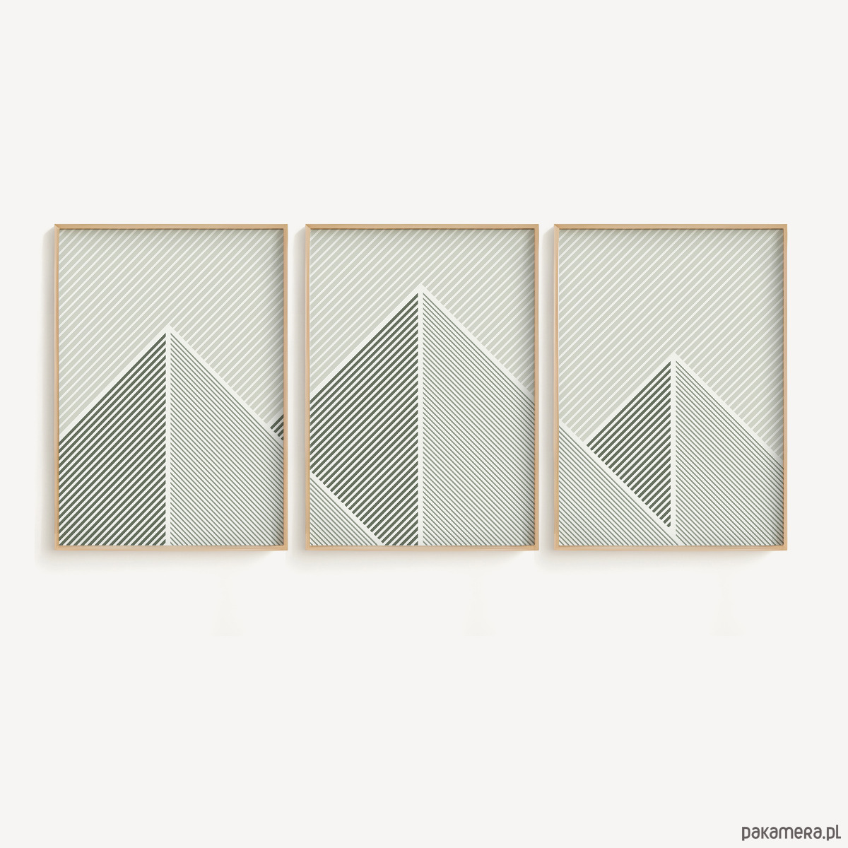 Tryptyk plakatów liniowych z motywem przypominającym górski krajobraz. Proste, geometryczne formy oraz stonowana, zielona kolorystyka tworzą spójną kompozycję, która dobrze odnajdzie się w aranżacjach w stylu skandynawskim, japandi, nowoczesnym oraz minimalistycznym.
