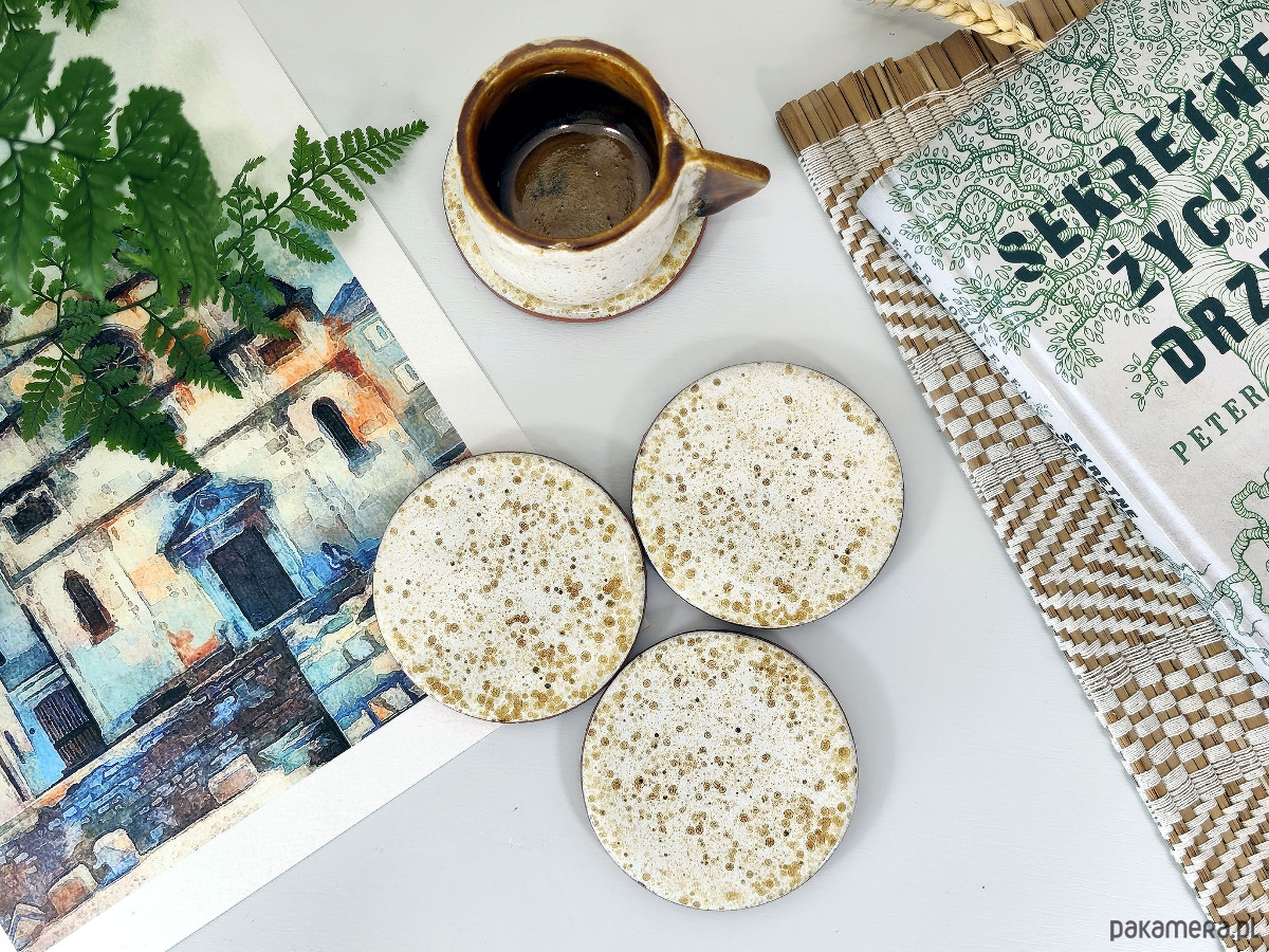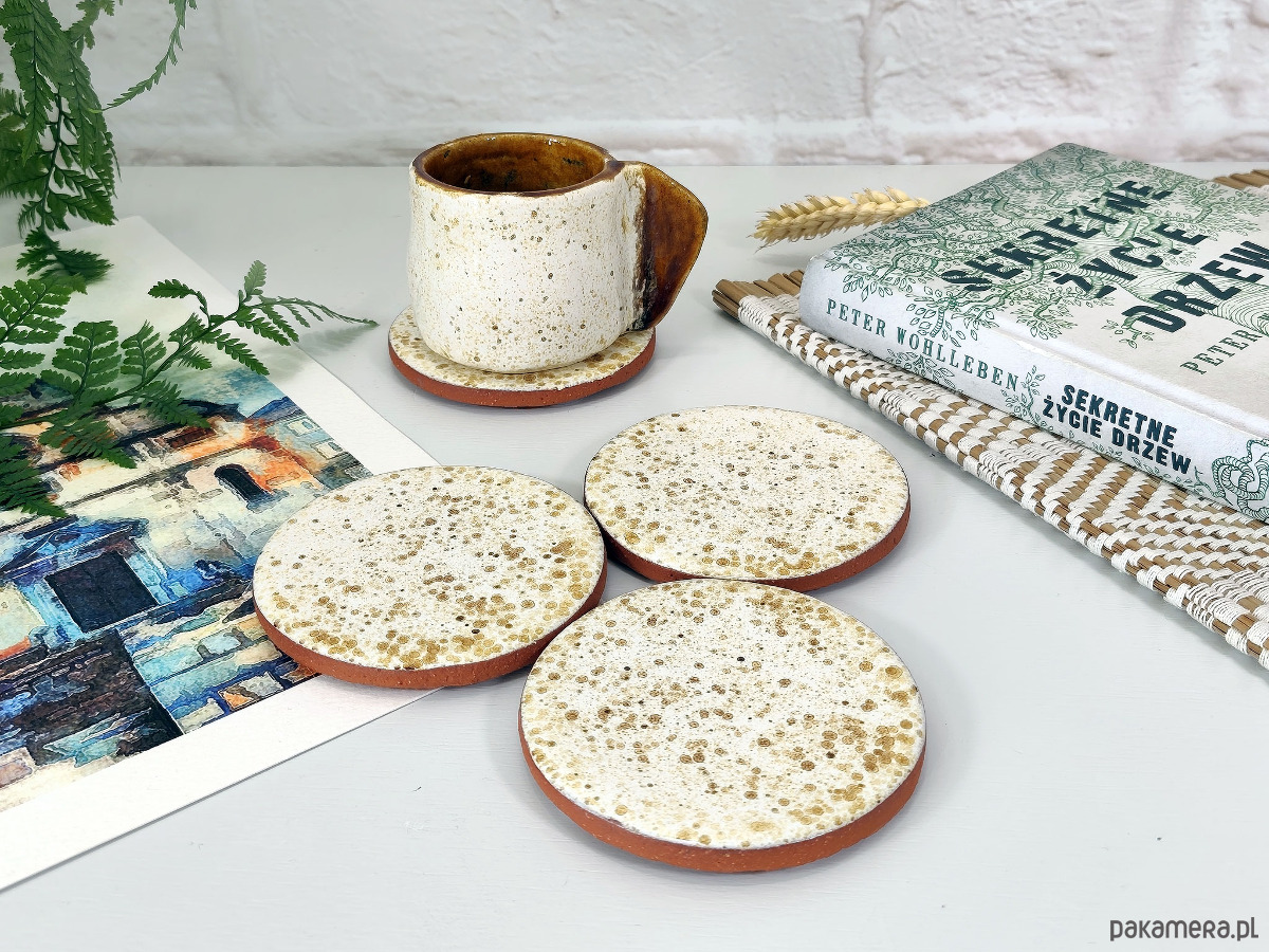Podstawki ceramiczne stworzone z myślą o chwilach przy ulubionej herbacie i dobrej lekturze. Połączenie surowego spodu z gładkim, kropkowanym wierzchem tworzy unikalny design, który idealnie uzupełni wnętrza w stylu hygge, boho czy skandynawskim.