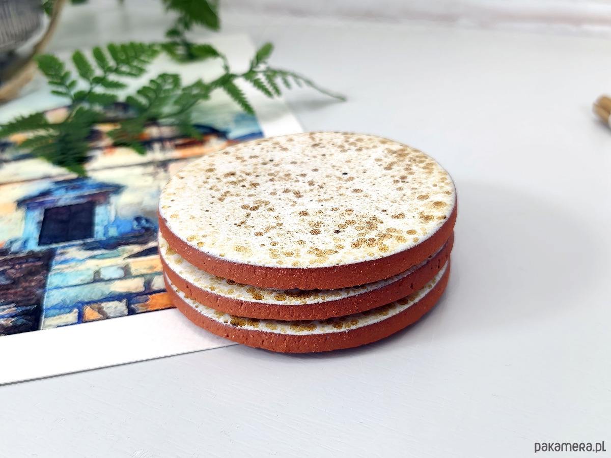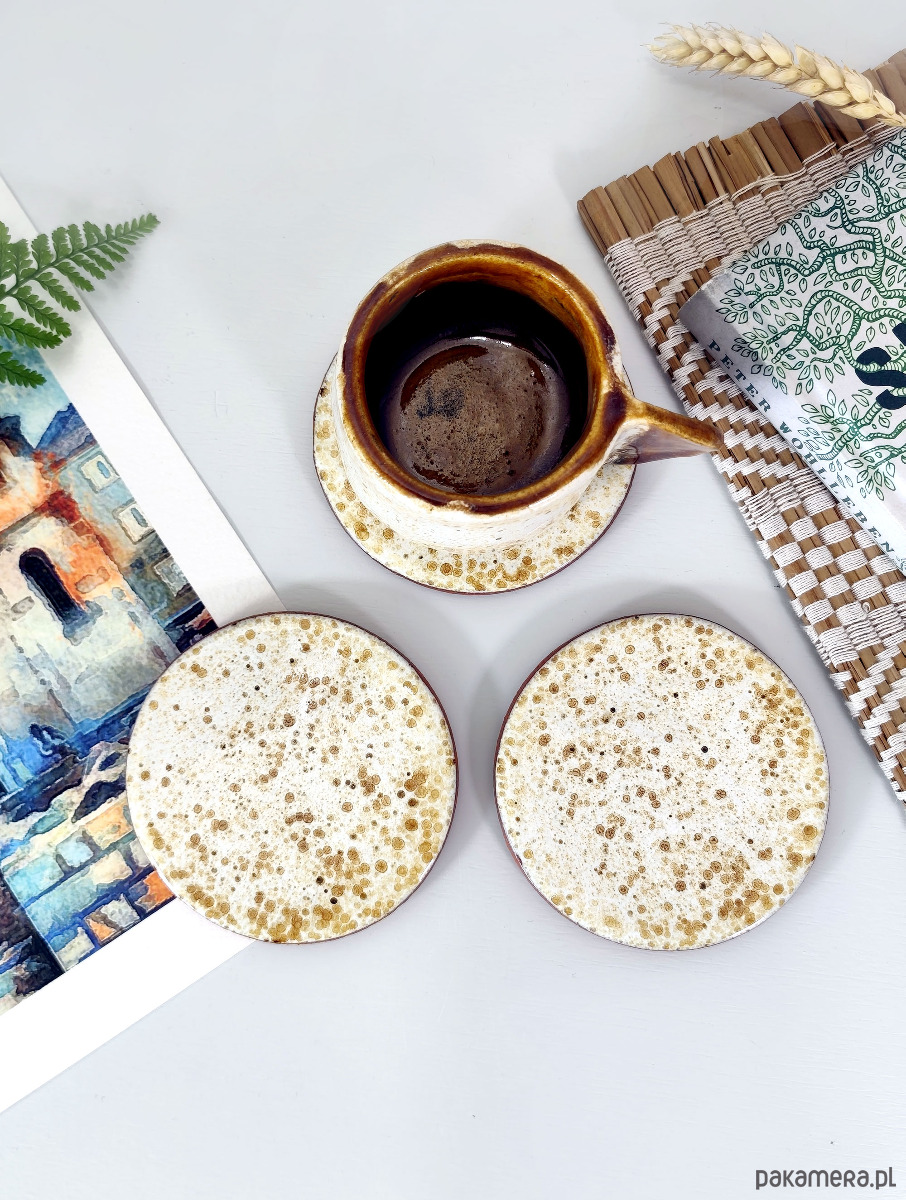 Podstawki ceramiczne stworzone z myślą o chwilach przy ulubionej herbacie i dobrej lekturze. Połączenie surowego spodu z gładkim, kropkowanym wierzchem tworzy unikalny design, który idealnie uzupełni wnętrza w stylu hygge, boho czy skandynawskim.