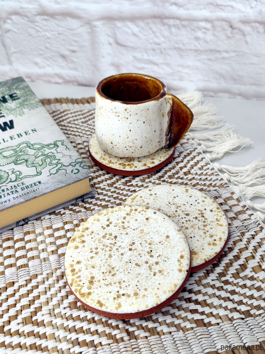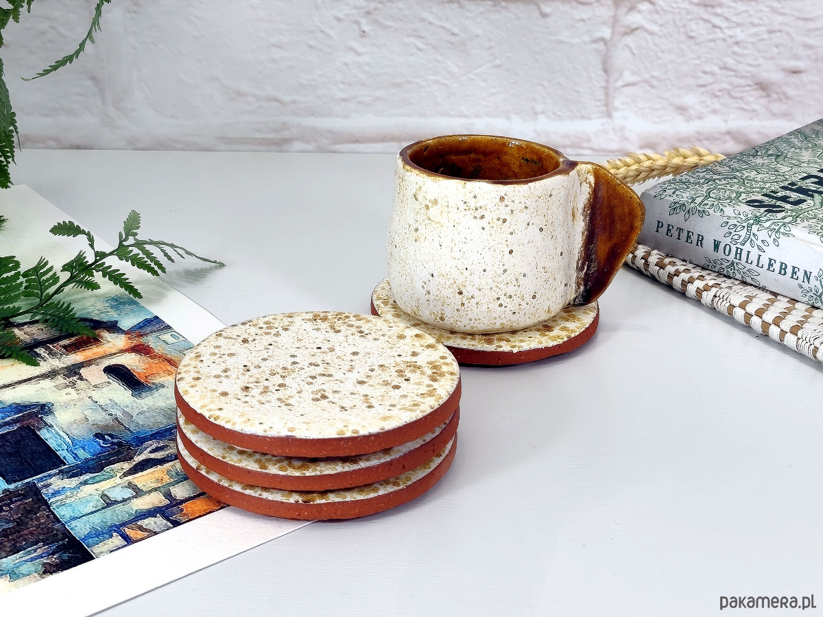 Podstawki ceramiczne stworzone z myślą o chwilach przy ulubionej herbacie i dobrej lekturze. Połączenie surowego spodu z gładkim, kropkowanym wierzchem tworzy unikalny design, który idealnie uzupełni wnętrza w stylu hygge, boho czy skandynawskim.