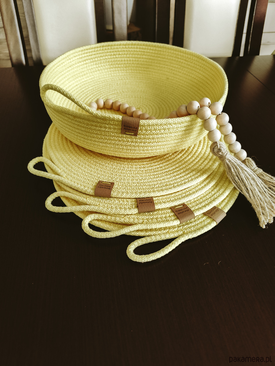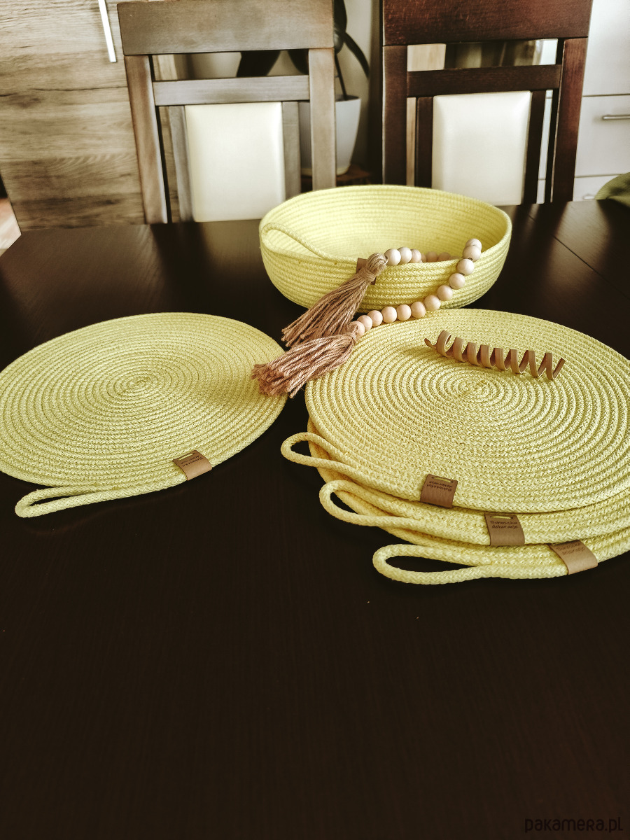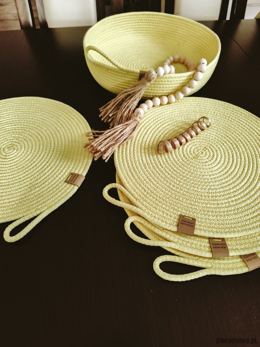 Komplet podkładek na stół z koszykiem. Wygląda przepięknie w ślicznym cytrynowym kolorze. Idealne na nadchodzą wiosnę i Wielkanoc.