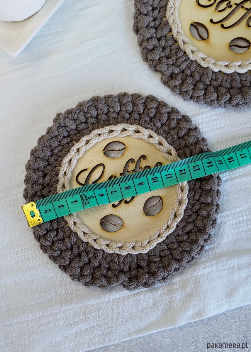 - Zestaw podkładek składa się z drewnianej bazy, obszydełkowanej 100% bawełnianym sznurkiem, co czyni go wyjątkowym i unikalnym.