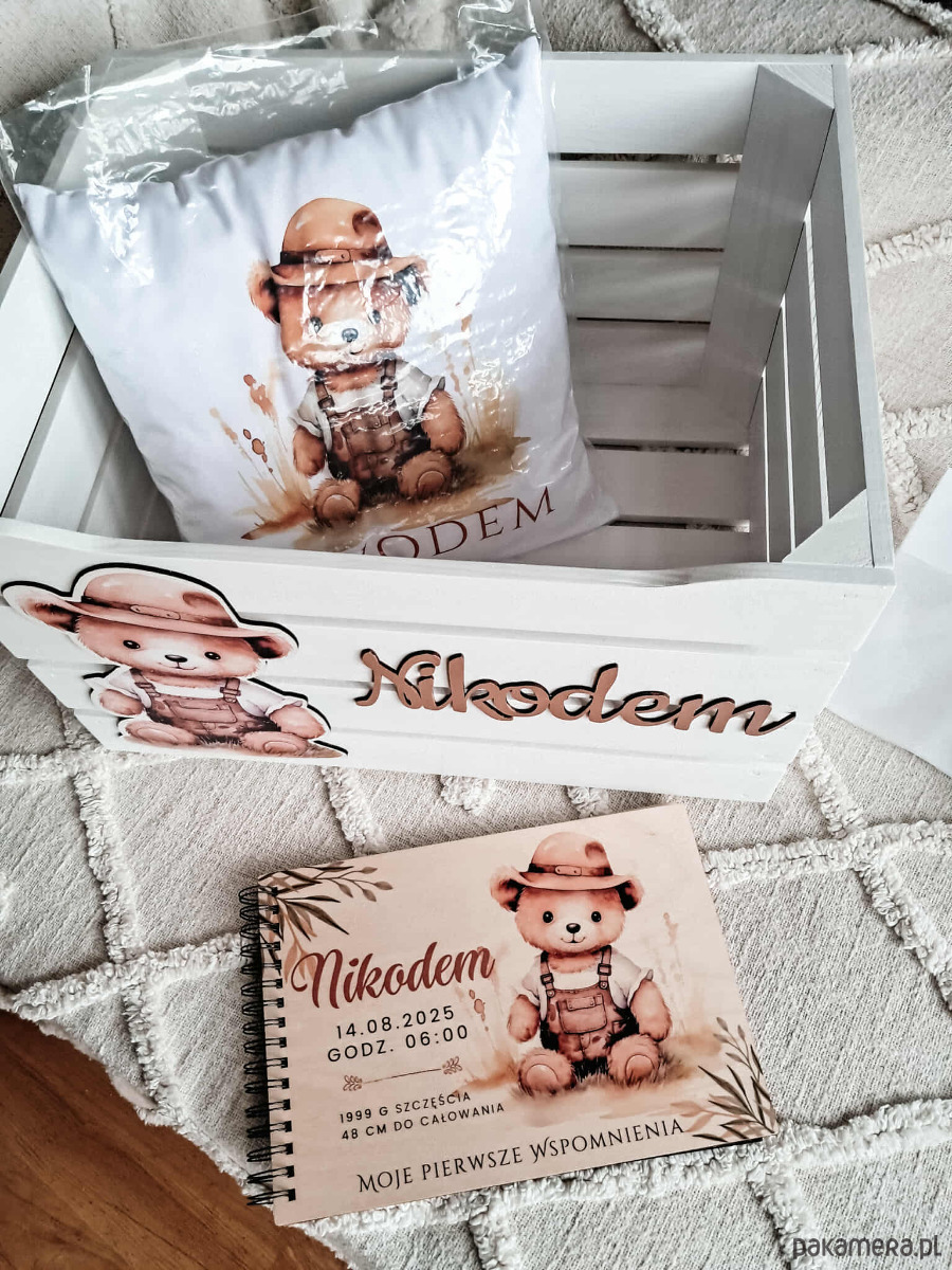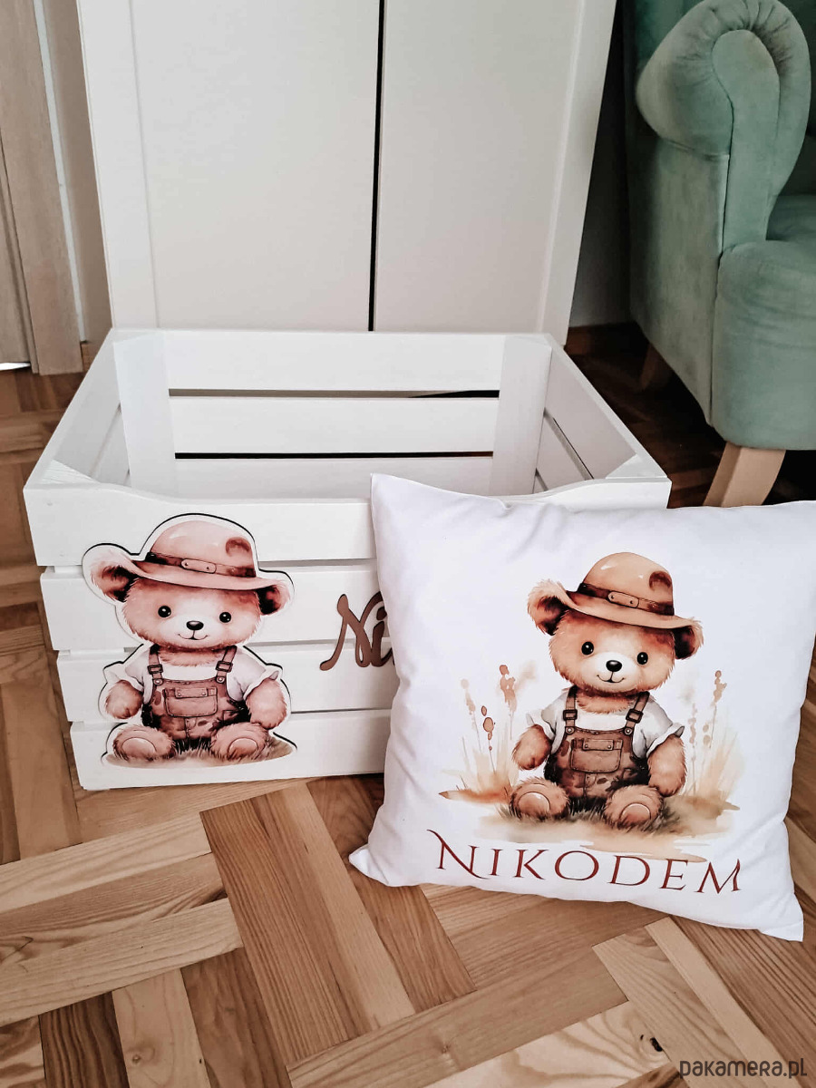 W zestawie personalizowana poduszka 40x40 z grafiką jak na skrzyni.