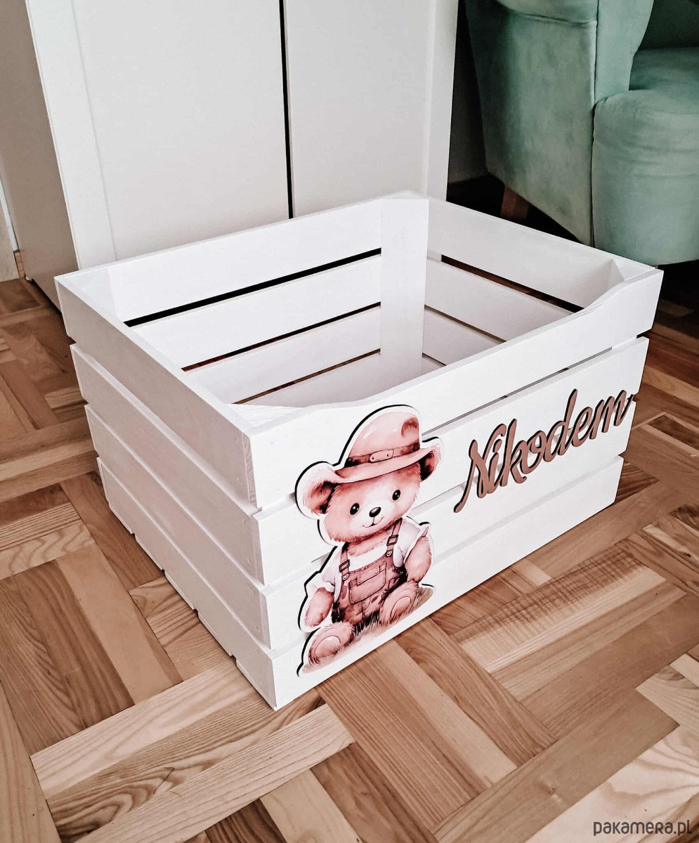 Skrzynia-Piękny, funkcjonalny mebel do pokoju dziecka. Skrzynia na zabawki z dekorem misia i imieniem dziecka. Wszystko wykonane z dbałością o każdy szczegół.