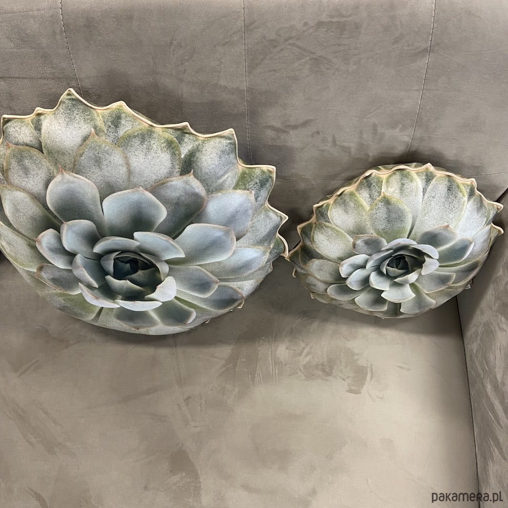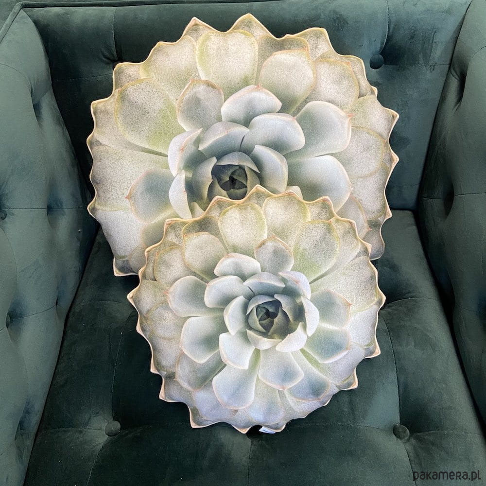 poduszka duża ma średnicę 45 cm i 13 cm grubości. Doskonale sprawdzi się jako piękna ozdoba w salonie lub urodzinowy prezent dla miłośnika roślin, sukulentów, a przede wszystkim trendów Urban Jungle. Oryginalny kształt poduszki-rośliny wykonany z wysokiej jakości materiału i precyzyjnego nadruku. Widoczne wszystkie detale prawdziwego sukulenta. Najwyższa jakość wykonania.