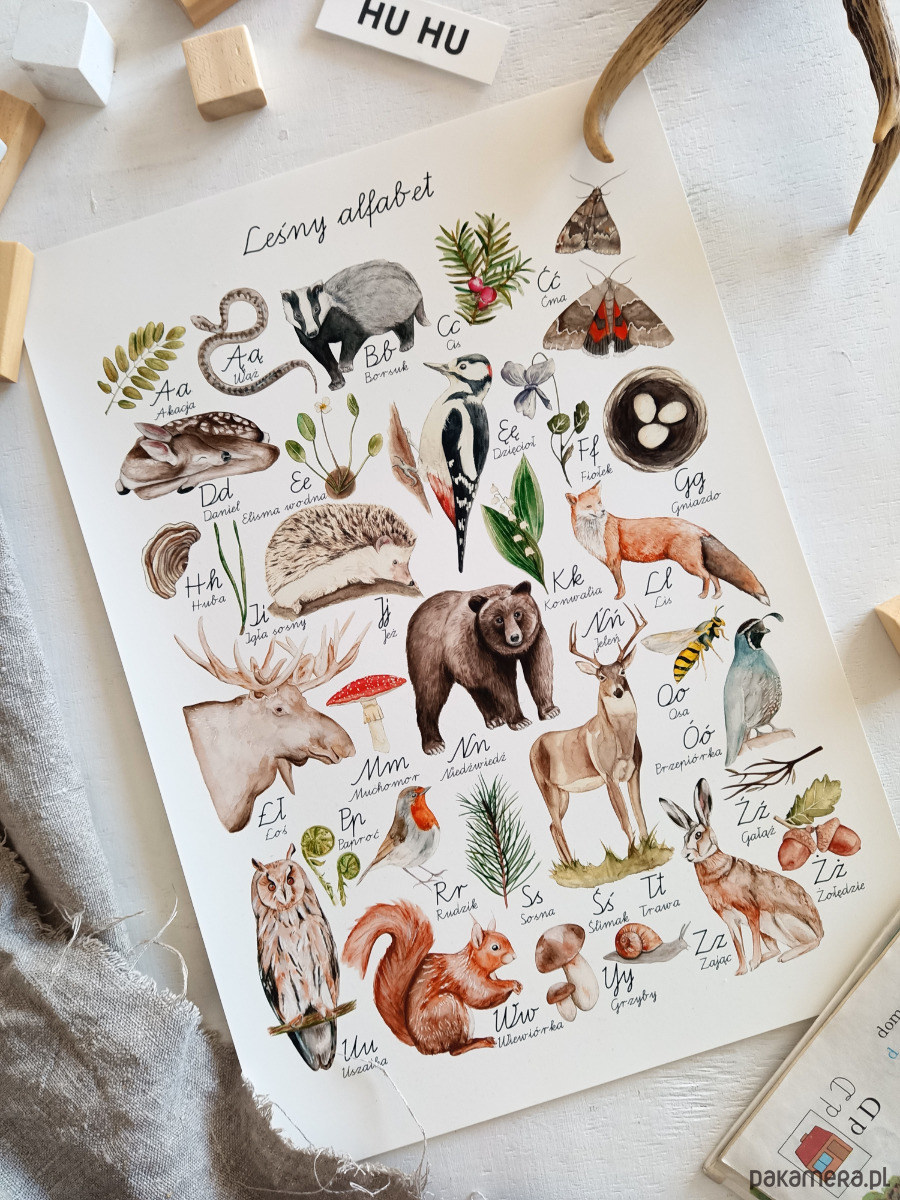 ⭐Plakat alfabet z bogactwami z prawdziwego lasu, nie dość, że pomaga w zapamiętywaniu alfabetu to uczy poznawać środowisko. Podczas spacerów po lesie zachęci dziecko do obcowania z przyrodą.