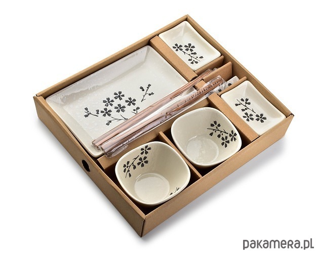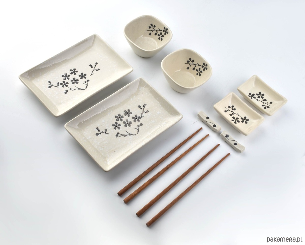 Zestaw zawiera 2 komplety pałeczek, podstawki pod pałeczki, 2 miseczki na sos, 2 miseczki oraz 2 prostokątne talerzyki. Naczynia są na tyle uniwersalne, że można wykorzystać je również do innych celów w zależności od pomysłu i zapotrzebowania.