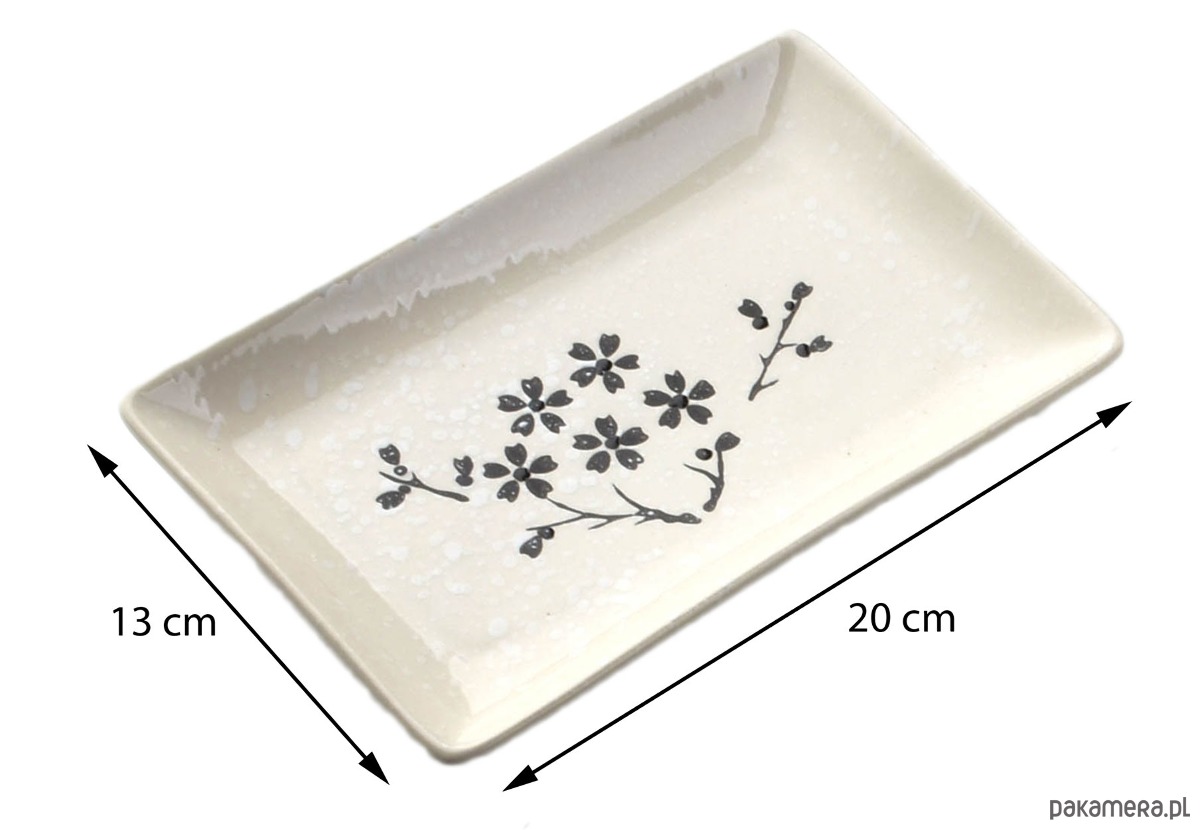 Porcelanowy zestaw do sushi składający się z 10 elementów, zdobiony kwiatami i japońskimi napisami na beżowym tle, idealny pomysł na prezent.