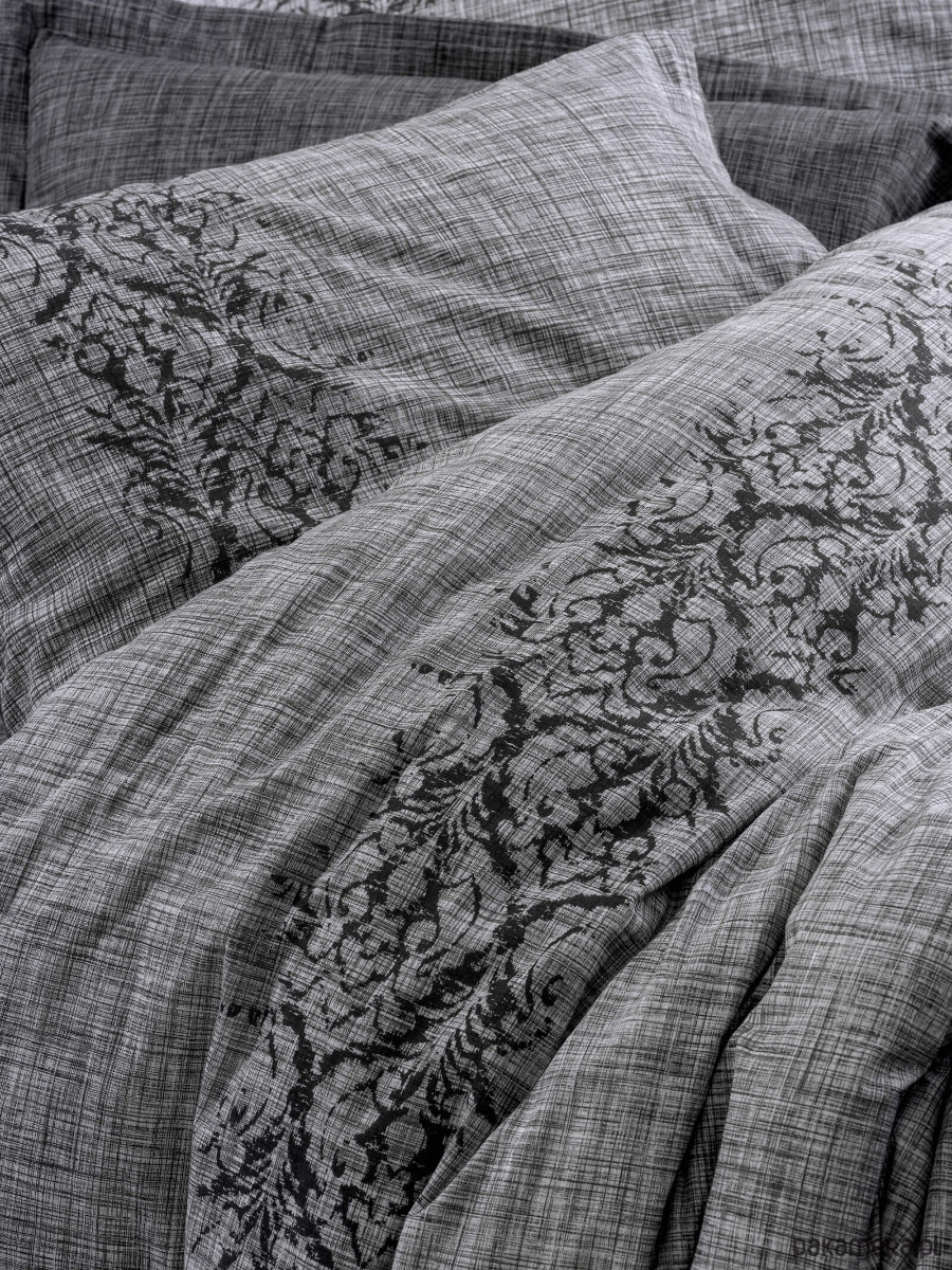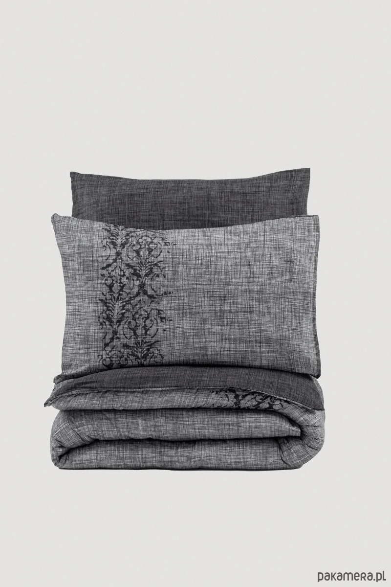 Pościel z najwyższej jakości bawełny typu RANFORCE (gęsto tkana, delikatnie chropowata w dotyku jak len) w melanżowym odcieniu grafitowo-czarnym z pięknym, czarnym haftem w stylu barokowym na poszwach. Wygląda jak z najdroższej galerii wnętrzarskiej – surowa elegancja w najlepszym wydaniu.