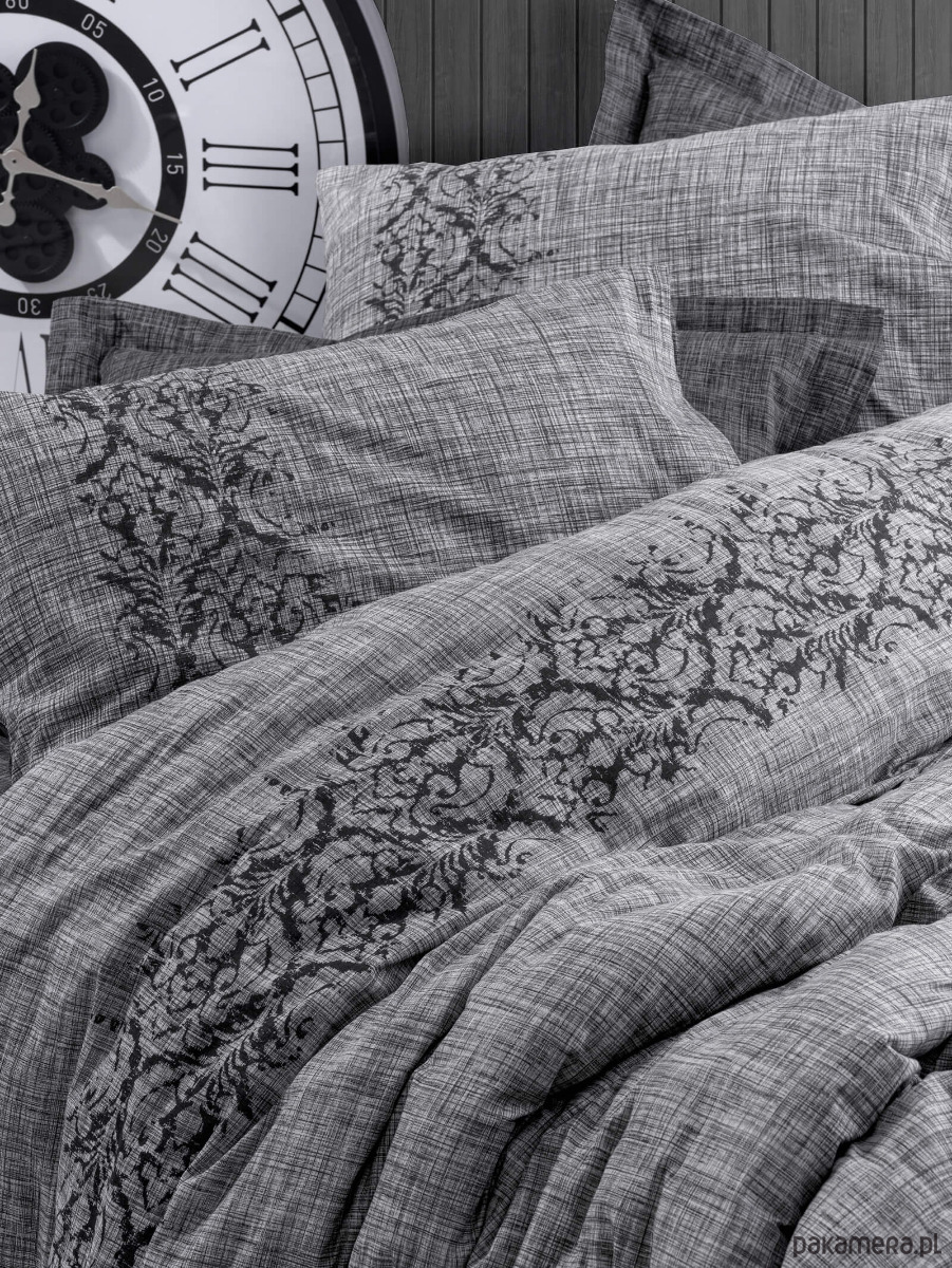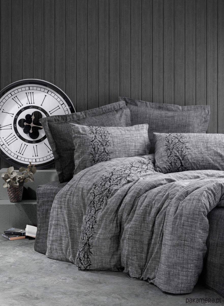 Pościel z najwyższej jakości bawełny typu RANFORCE (gęsto tkana, delikatnie chropowata w dotyku jak len) w melanżowym odcieniu grafitowo-czarnym z pięknym, czarnym haftem w stylu barokowym na poszwach. Wygląda jak z najdroższej galerii wnętrzarskiej – surowa elegancja w najlepszym wydaniu.