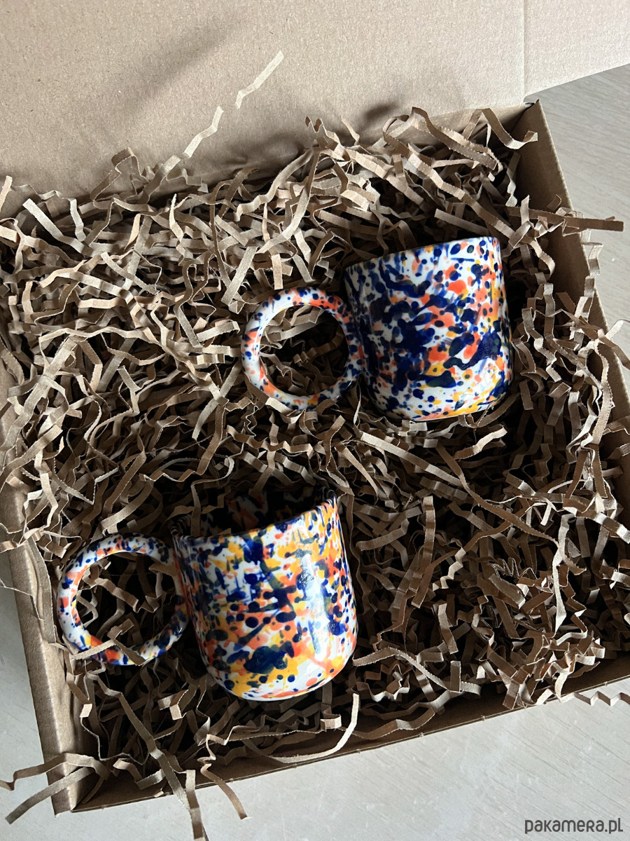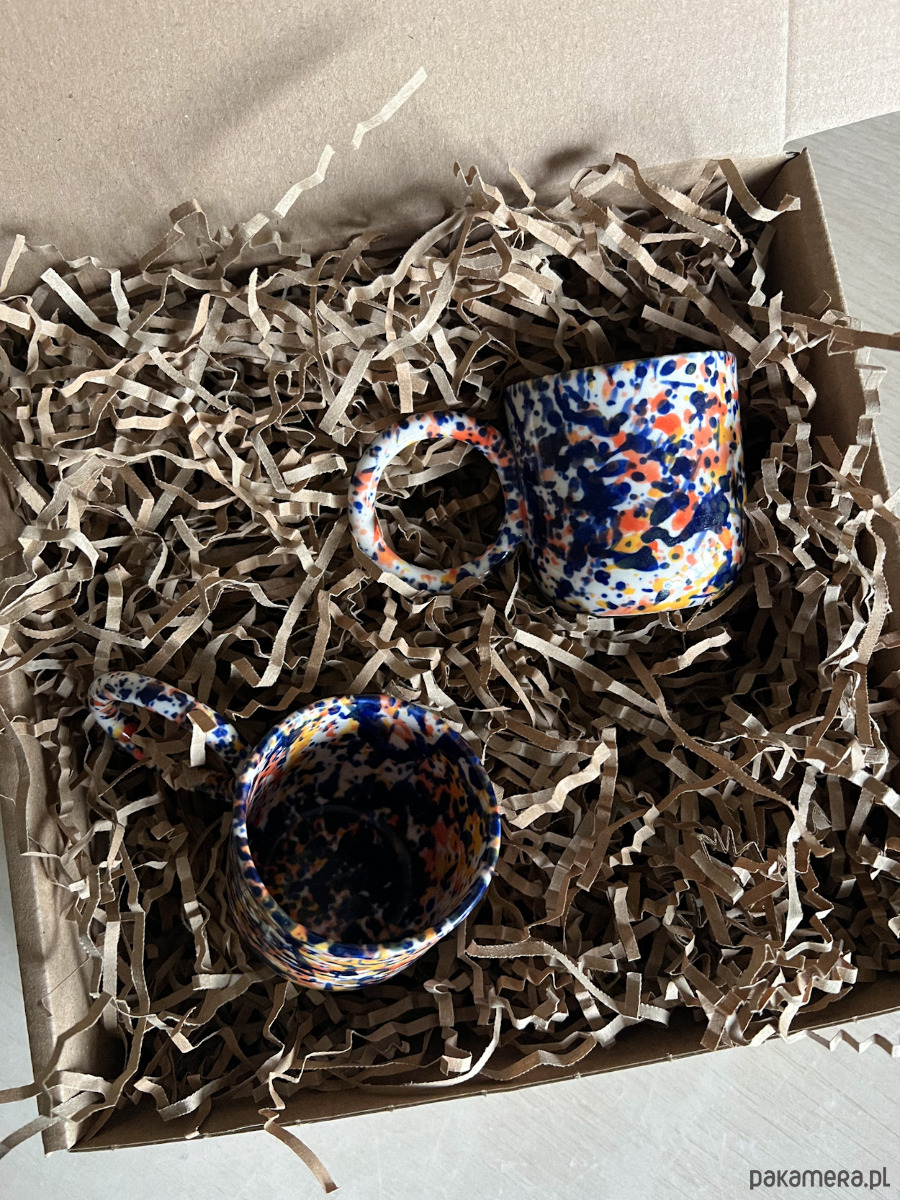 Zestaw dwóch porcelanowych kubeczków do podwójnego espresso, zapakowane na prezent gotowe do położenia pod choinką.