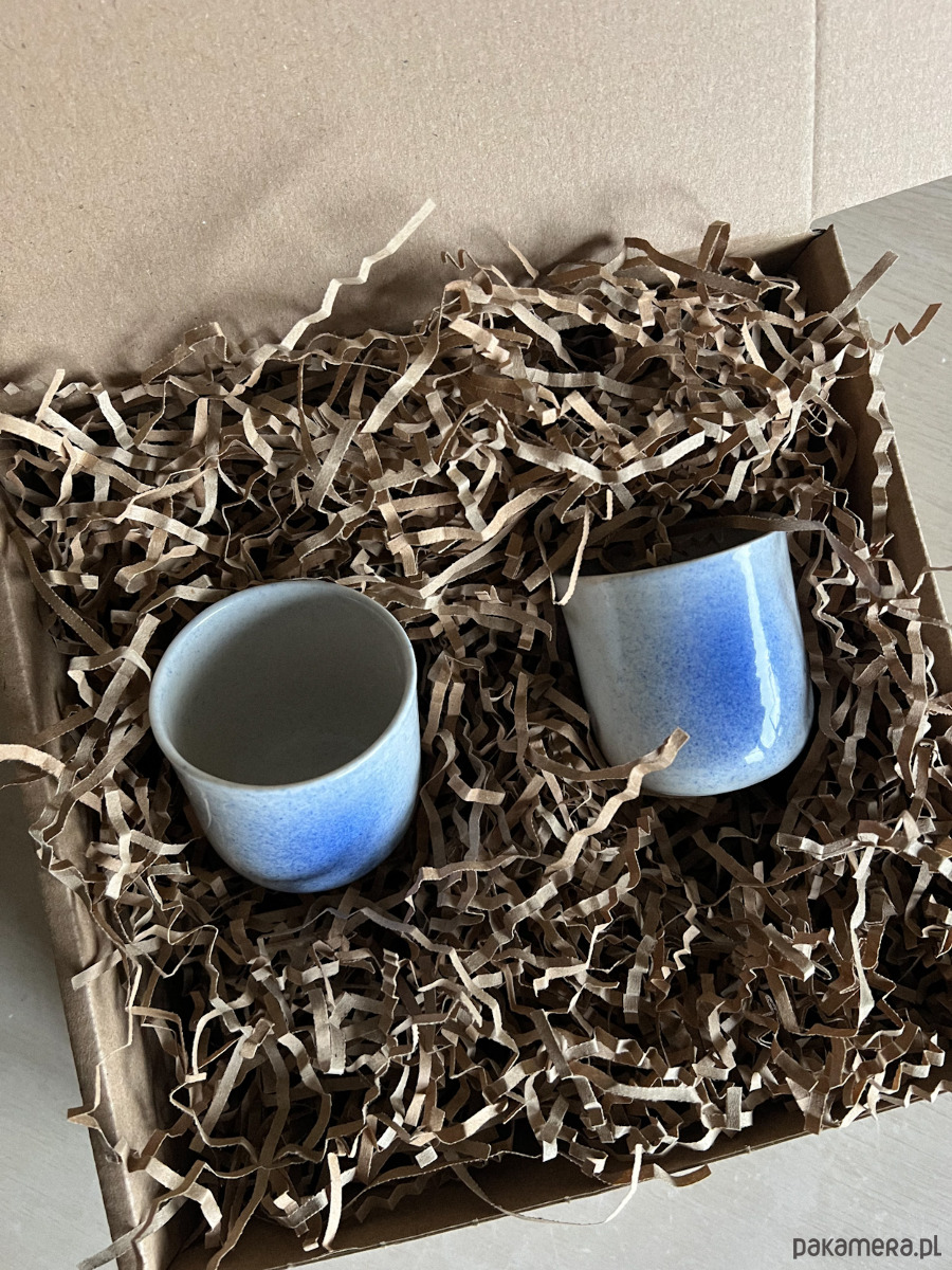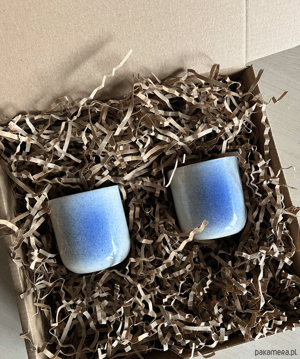 Zestaw dwóch porcelanowych kubeczków do espresso, zapakowane na prezent gotowe do położenia pod choinką.