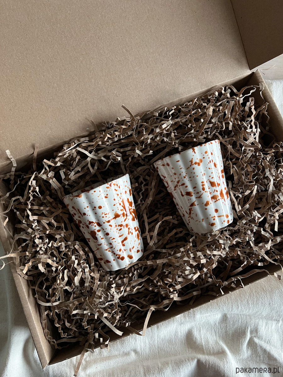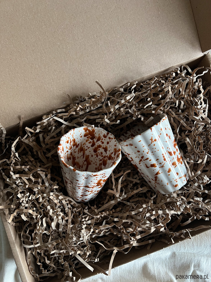 Zestaw dwóch porcelanowych kubeczków nakrapianych czekoladowych o pojemności 180 ml, zapakowane na prezent gotowe do położenia pod choinką.