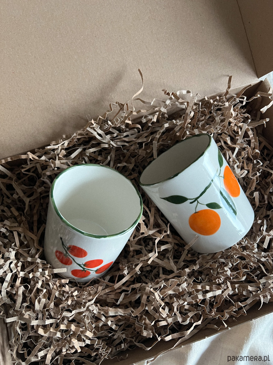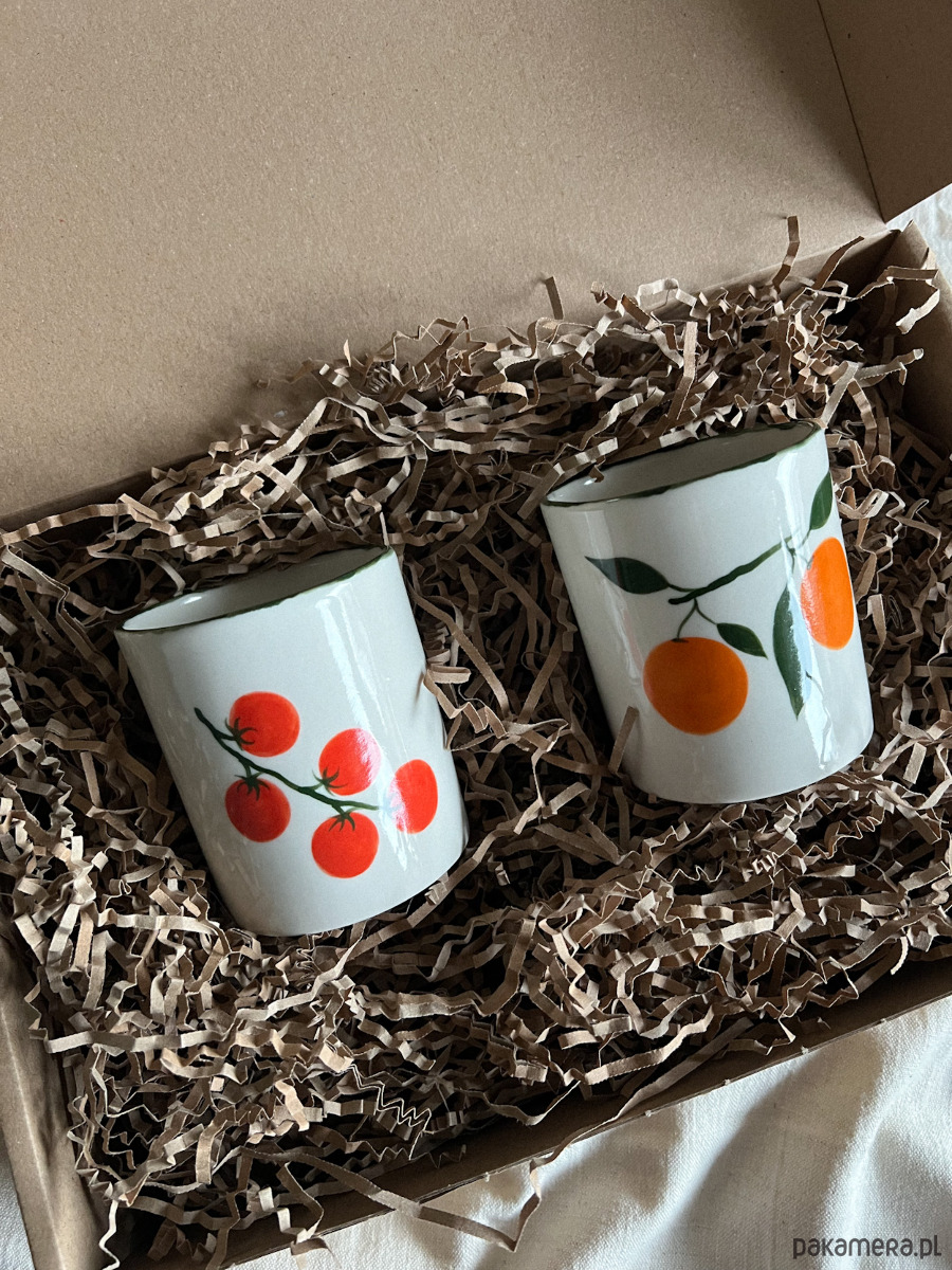 Zestaw dwóch porcelanowych kubeczków o pojemności 300 ml, zapakowane na prezent gotowe do położenia pod choinką.