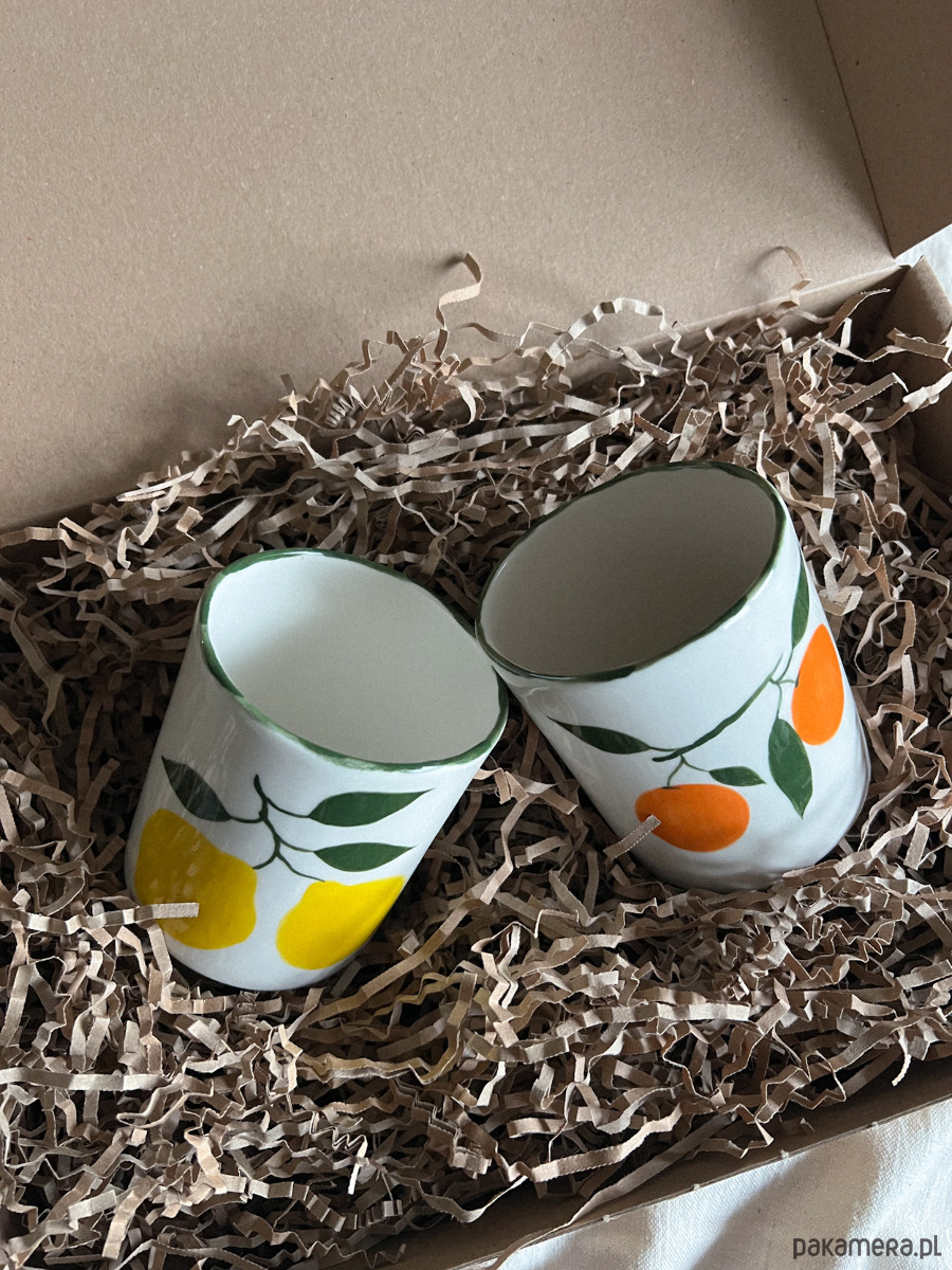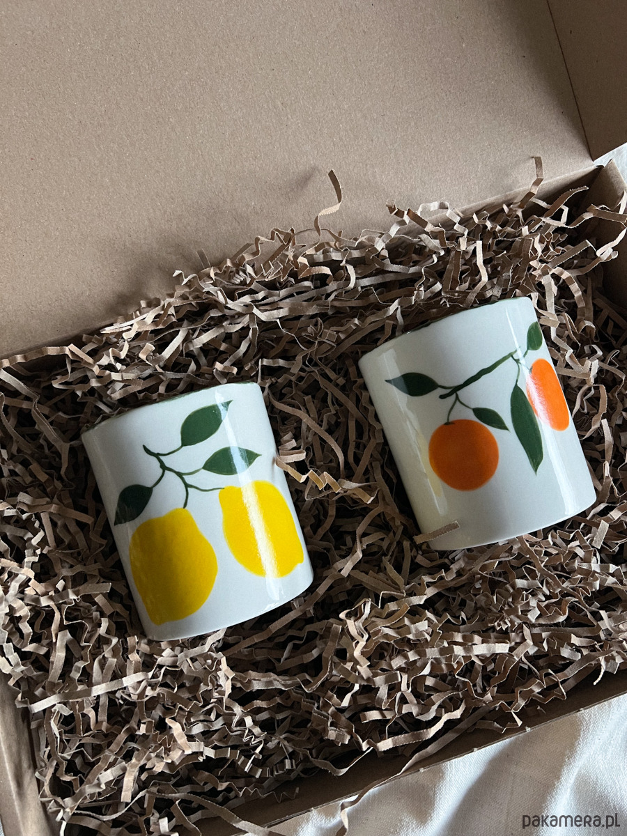 Zestaw dwóch porcelanowych kubeczków o pojemności 300 ml, zapakowane na prezent gotowe do położenia pod choinką.