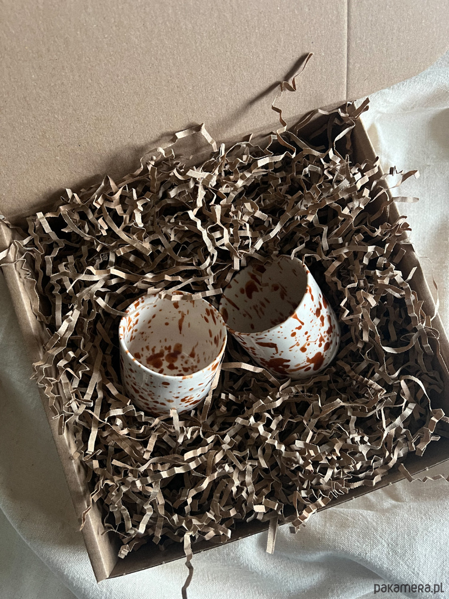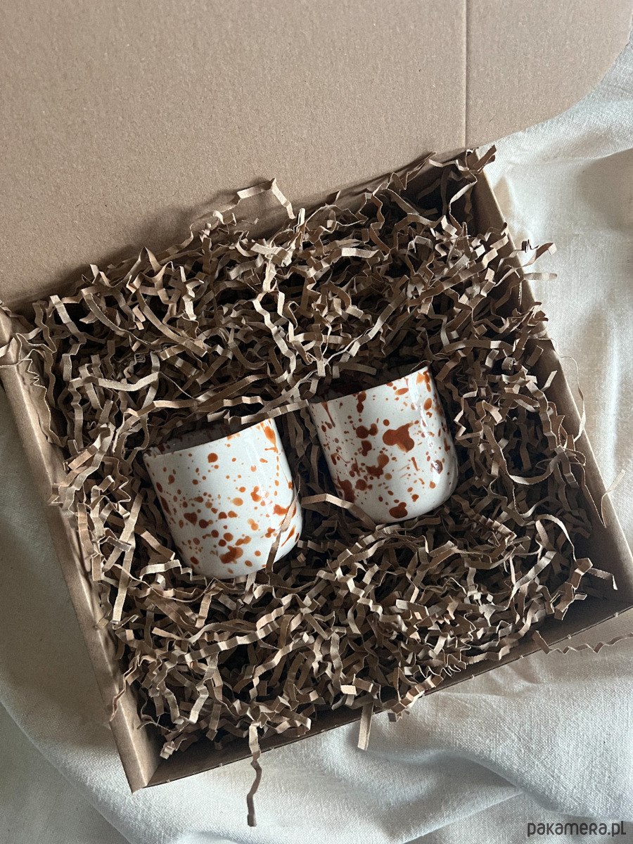Zestaw dwóch porcelanowych kubeczków na podwójne espresso, zapakowane na prezent gotowe do położenia pod choinką.