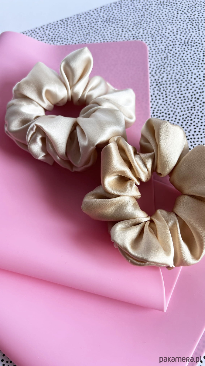 - 2 ręcznie wykonane gumki scrunchie z naturalnego jedwabiu w wybranych przez Ciebie kolorach,