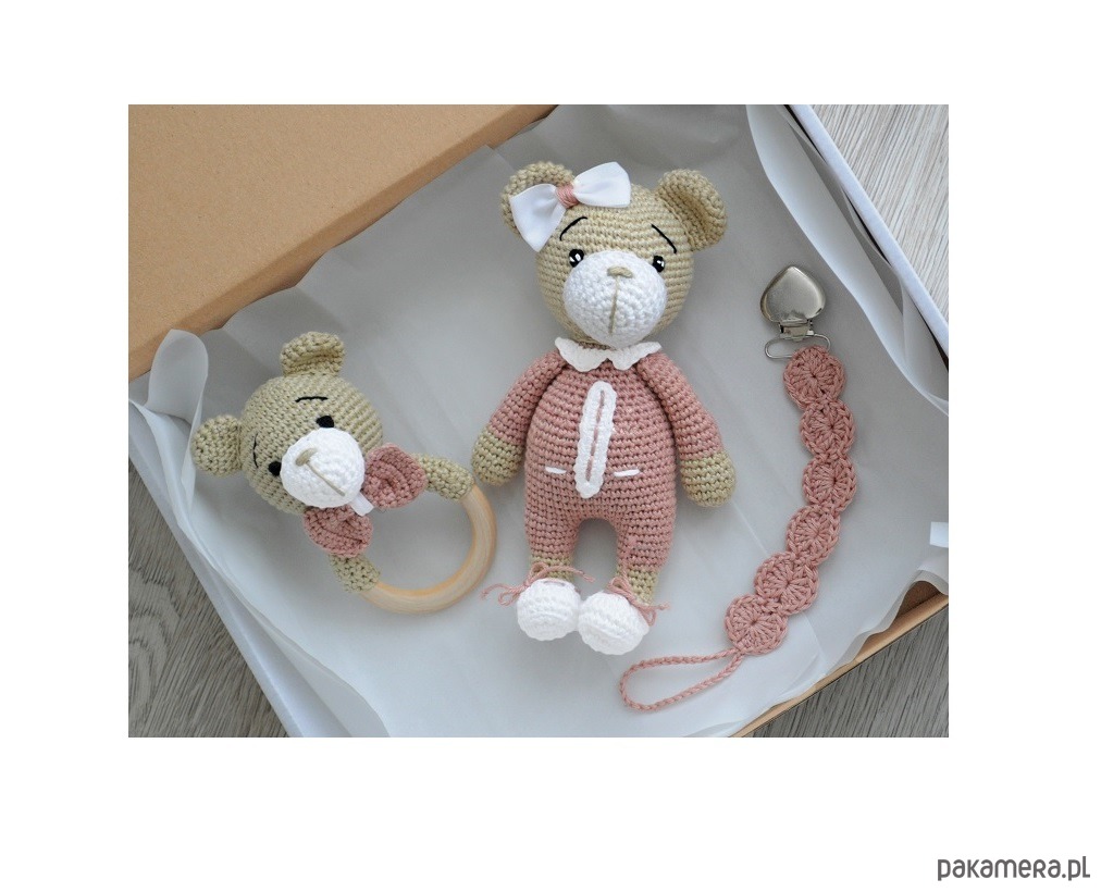 - grzechotki z głową misia; wys. 13cm, szer. 7cm, miś wydaje delikatny grzechoczący dźwięk