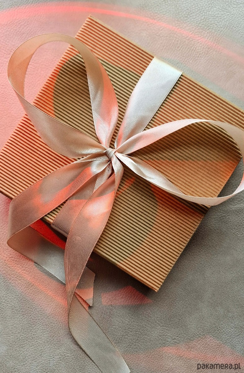 Całość zapakowana w karbowane pudełko z brzoskwiniową kokardą, gotowe do wręczenia jako prezent – bez dodatkowego pakowania.
