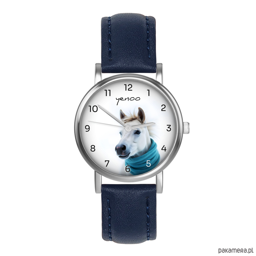 Zestaw prezentowy - Biały koń - zegarek i brelok - skórzany, granatowy